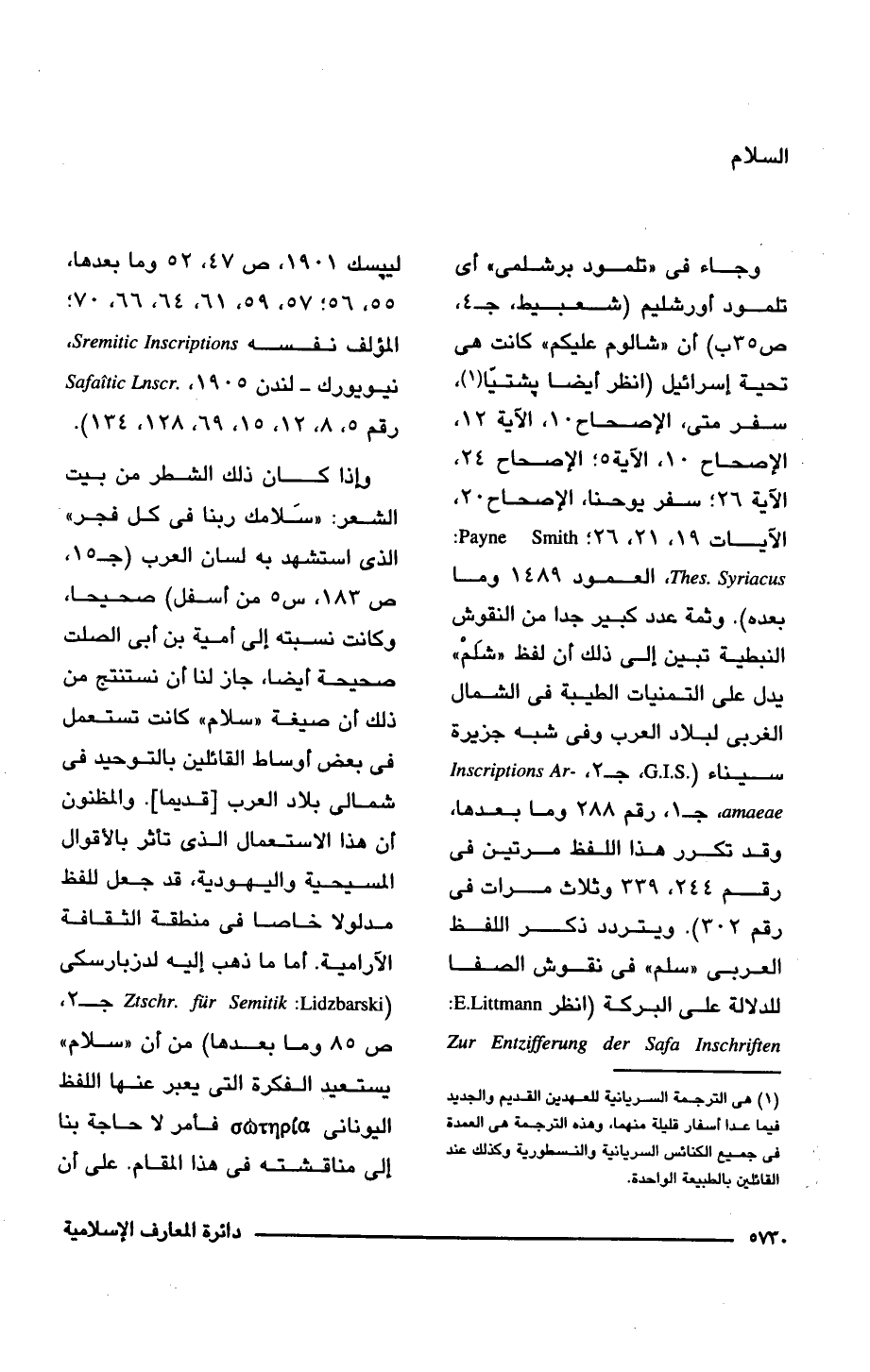 وإذا كان ذلك الشطر من بيت الشعر: "سَلامك ربنا فى كل فجر" الذى استشهد به لسان العرب (جـ 15، ص 183، س 5 من أسفل) صحيحا، وكانت نسبته إلى أمية بن أبى الصلت صحيحة أيضا، جاز لنا أن نستنتج من ذلك أن صيغة "سلام" كانت تستعمل فى بعض أوساط القائلين بالتوحيد فى شمالى بلاد العرب [قديما]. والمظنون أن هذا الاستعمال الذى تأثرث بالأقوال المسيحية واليهودية، قد جعل للفظ مدلولا خاصا فى منطقة الثقافة الآرامية. أما ما ذهب إليه لدزبارسكى (Ztschr.fur Semitik: Lidzbarski جـ 2، ص 85 وما بعدها) من أن "سلام" يستعيد الفكرة التى يعبر عنها اللفظ اليونانى (. . .) فأمر لا حاجة بنا إلى مناقشته فى هذا المقام. على أن