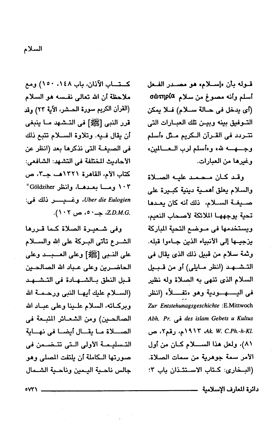 وقد كان محمد عليه الصلاة والسلام يعلق أهمية دينية كبيرة على صيغة السلام، ذلك أنه كان يعدها تحية يوجهها الملائكة لأصحاب النعيم، ويستخدمها فى موضع التحية المباركة يزجيها إلى الأنبياء الذين جاءوا قبله. وثمة سلام من قبيل ذلك الذى يقال فى التشهد (انظر ما يلى) أو من قبيل السلام الذى تنهى به الصلاة وله نظير فى اليهودية وهو "تِفِلًا" (انظر Zur Entstehunagsgeschichte des islam Gebets u Kultus: E.Mittwoch فى Abh. Pr.AK- W. C.Ph -h-Kl، 1913 م رقم 2، ص 81)، ولعل هذا السلام كان من أول الأمر سمة جوهرية من سمات الصلاة. (البخارى: كتاب الاستئذان باب 3؛ كتاب الآذان، باب 148، 150) ومع ملاحظة أن اللَّه تعالى نفسه هو السلام (القرآن الكريم سورة الحشر، الآية 23) وقد قرر النبى [-صلى اللَّه عليه وسلم-] فى التشهد ما ينبغى أن يقال فيه. وتلاوة السلام تتبع ذلك فى الصيغة التى نذكرها بعد (انظر عن الأحاديث المختلفة فى التشهد: الشافعى: كتاب الأم، القاهرة 1321 هـ، جـ 3، ص 103 وما بعدها، وانظر Goldziher Uber die Eulogien, وغير ذلك فى: Z.D.M.G، جـ 50، ص 102).