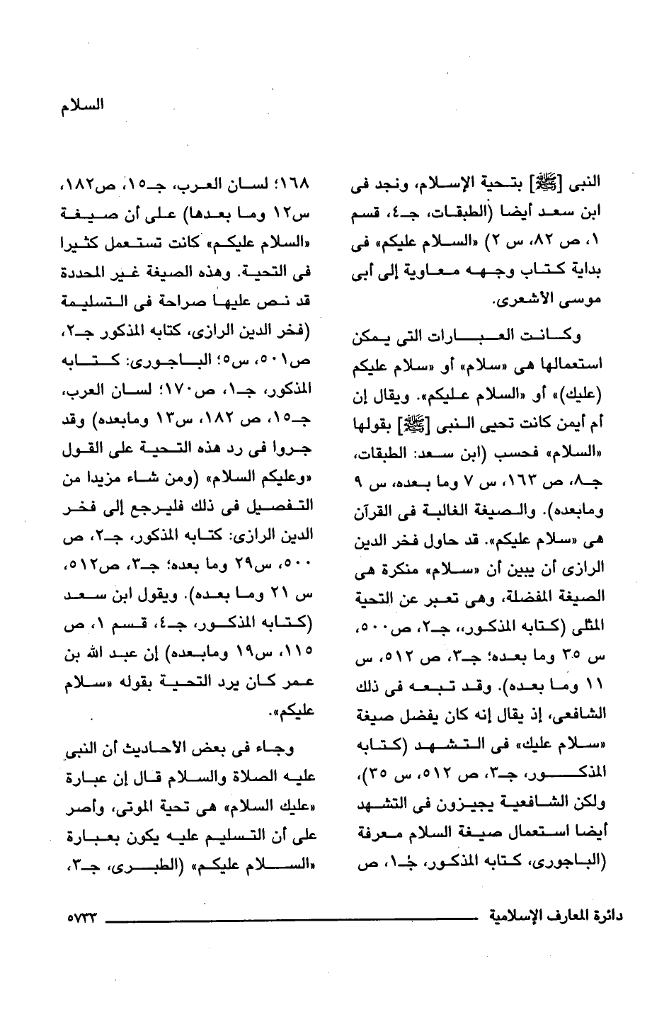 وكانت العبارات التى يمكن استعمالها هى "سلام" أو "سلام عليكم (عليك) " أو "السلام عليكم". ويقال إن أم أيمن كانت تحيى النبى [-صلى اللَّه عليه وسلم-] بقولها "السلام" فحسب (ابن سعد: الطبقات، جـ 8، ص 163، س 7 وما بعده، س 9 وما بعده). والصيغة الغالبة فى القرآن هى "سلام عليكم". قد حاول فخر الدين الرازى أن يبين أن "سلام" منكرة هى الصيغة المفضلة، وهى تعبر عن التحية المثلى (كتابه المذكور، جـ 2، ص 500، س 35 وما بعده؛ جـ 3، ص 512، س 11 وما بعده). وقد تبعه فى ذلك الشافعى، إذ يقال إنه كان يفضل صيغة "سلام عليك" فى التشهد (كتابه المذكور، جـ 3، ص 512، س 35)، ولكن الشافعية يجيزون فى التشهد أيضا استعمال صيغة السلام معرفة (الباجورى، كتابه المذكور، جـ 1، ص 168؛ لسان العرب، جـ 15، ص 182، س 12 وما بعدها) على أن صيغة "السلام عليكم" كانت تستعمل كثيرا فى التحية. وهذه الصيغة غير المحددة قد نص عليها صراحة فى التسليمة (فخر الدين الرازى، كتابه المذكور جـ 2، ص 501، س 5؛ الباجورى: كتابه المذكور، جـ 1، ص 170؛ لسان العرب، جـ 15، ص 182، س 13 وما بعده) وقد جروا فى رد هذه التحية على القول "وعليكم السلام" (ومن شاء مزيدا من التفصيل فى ذلك فليرجع إلى فخر الدين الرازى: كتابه المذكور، جـ 2، ص 500، س 29 وما بعده). جـ 3، ص 512، س 21 وما بعده). ويقول ابن سعد (كتابه المذكور، جـ 4، قسم 1، ص 115، س 19 وما بعده) إن عبد اللَّه بن عمر كان يرد التحية بقوله "سلام عليكم".