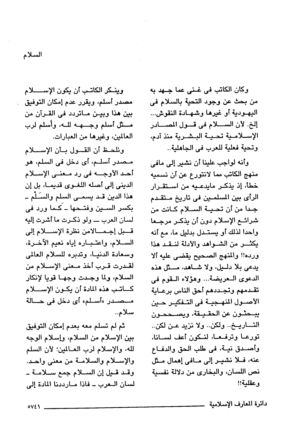 ثم لم تسلم معه بعدم إمكان التوفيق بين الإسلام من السلام، وإسلام الوجه للَّه، والإسلام لرب العالمين؛ لأن السلم والإسلام والسلامة من معنى واحد. وقد قيل إن السلام جمع سلامة -لسان العرب- فإذا ما رددنا المادة إلى
