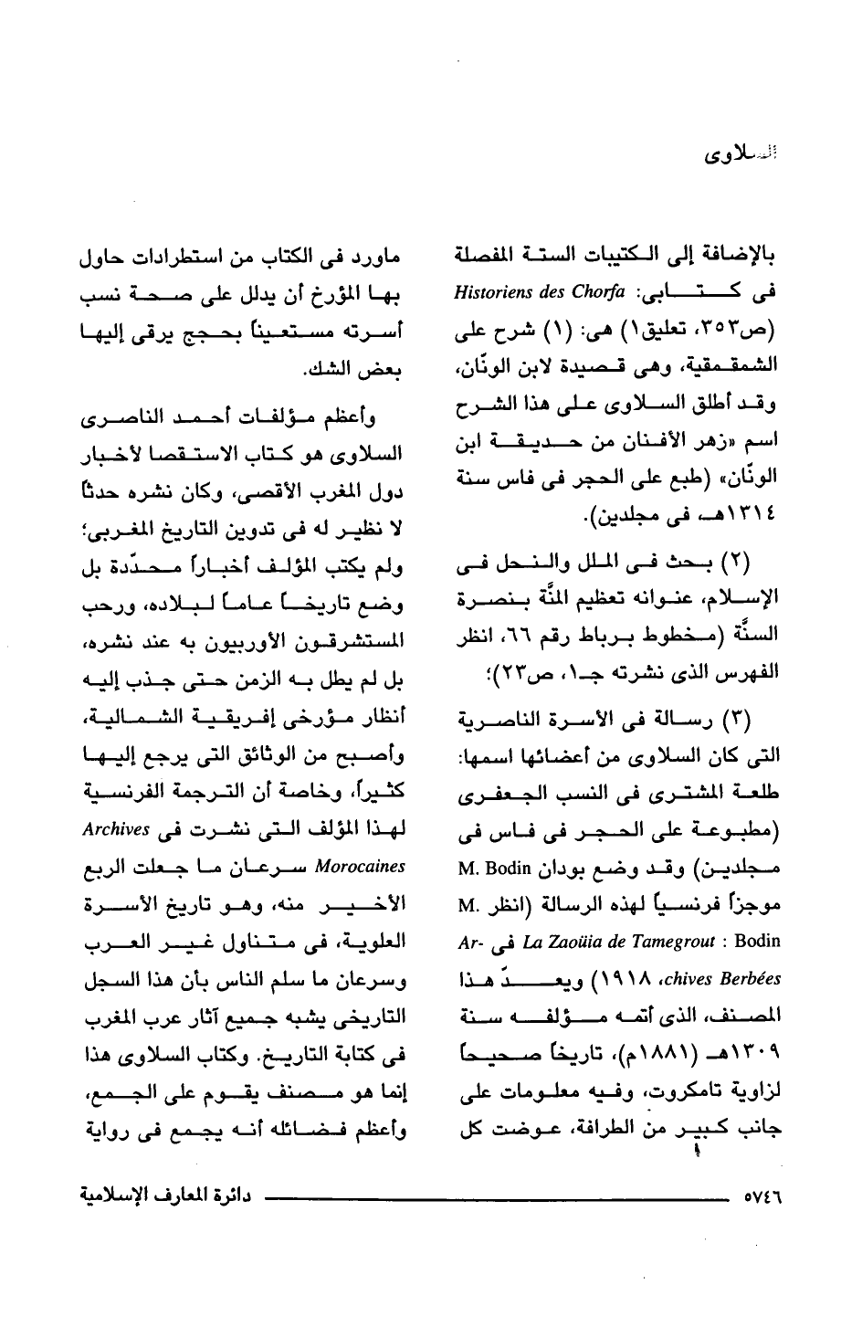 (3) رسالة فى الأسرة الناصرية التى كان السلاوى من أعضائها اسمها: طلعة المشترى فى النسب الجعفرى (مطبوعة على الحجر فى فاس فى مجلدين) وقد وضع بودان M. Bodin موجزًا فرنسيًا هذه الرسالة (انظر La Zaouia de Tamegrout: M.Bodin , فى Archives Berbees، 1918) ويعدّ هذا المصنف، الذى أتمه مؤلفه سنة