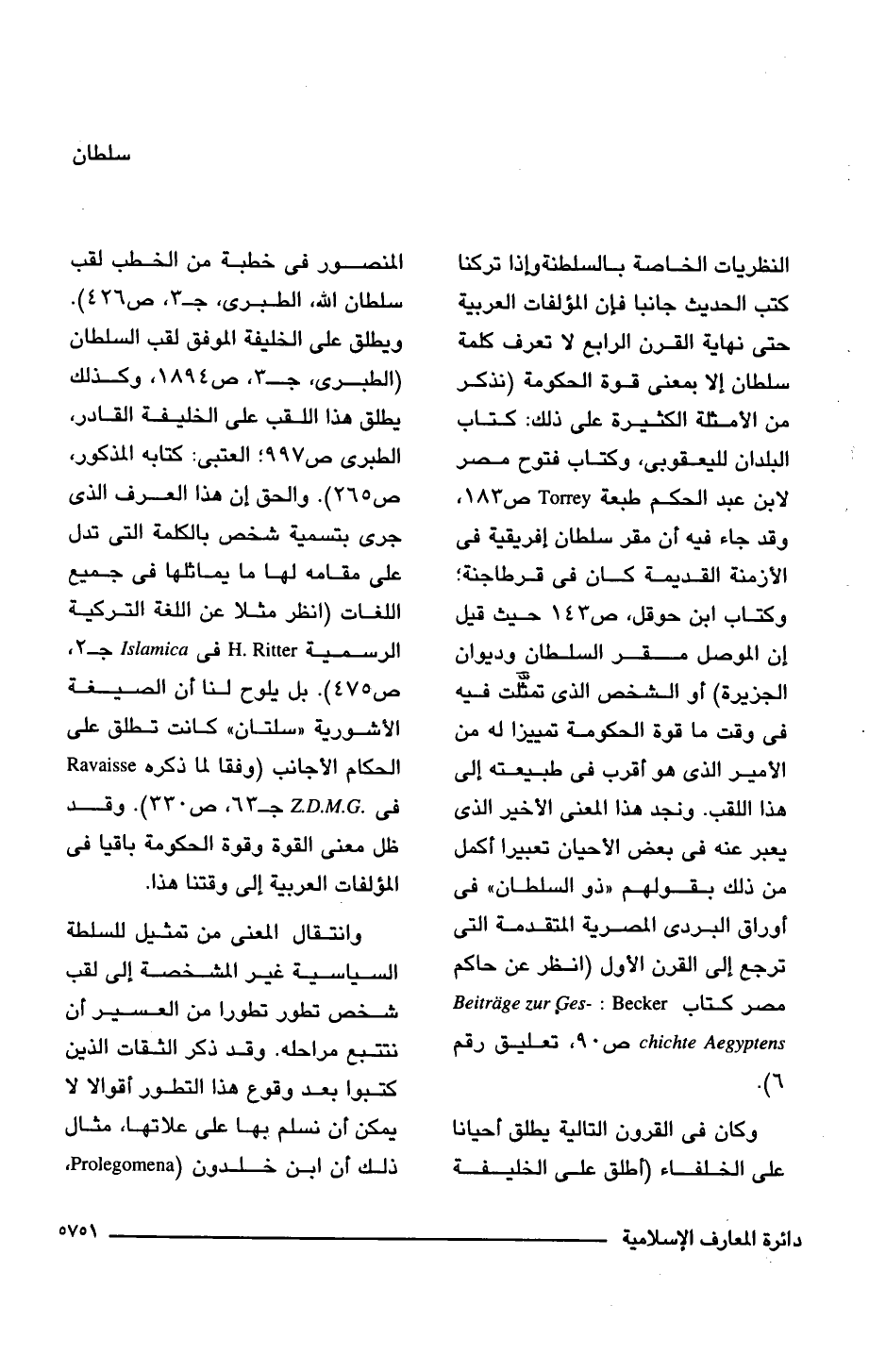 النظريات الخاصة بالسلطنة وإذا تركنا كتب الحديث جانبا فإن المؤلفات العربية حتى نهاية القرن الرابع لا تعرف كلمة سلطان إلا بمعنى قوة الحكومة (نذكر من الأمثلة الكثيرة على ذلك: كتاب البلدان لليعقوبى، وكتاب فتوح مصر لابن عبد الحكم طبعة Torrey ص 183، وقد جاء فيه أن مقر سلطان إفريقية فى الأزمنة القديمة كان فى قرطاجنة؛ وكتاب ابن حوقل، ص 143 حيث قيل إن الموصل مقر السلطان وديوان الجزيرة) أو الشخص الذى تمثَّلت فيه فى وقت ما قوة الحكومة تمييزا له من الأمير الذى هو أقرب فى طبيعته إلى هذا اللقب. ونجد هذا المعنى الأخير الذى يعبر عنه فى بعض الأحيان تعبيرا أكمل من ذلك بقولهم "ذو السلطان" فى أوراق البردى المصرية المتقدمة التى ترجع إلى القرن الأول (انظر عن حاكم مصر كتاب Beitrage zur Geschichte Aegyptens: Becker ص 90، تعليق رقم 6).