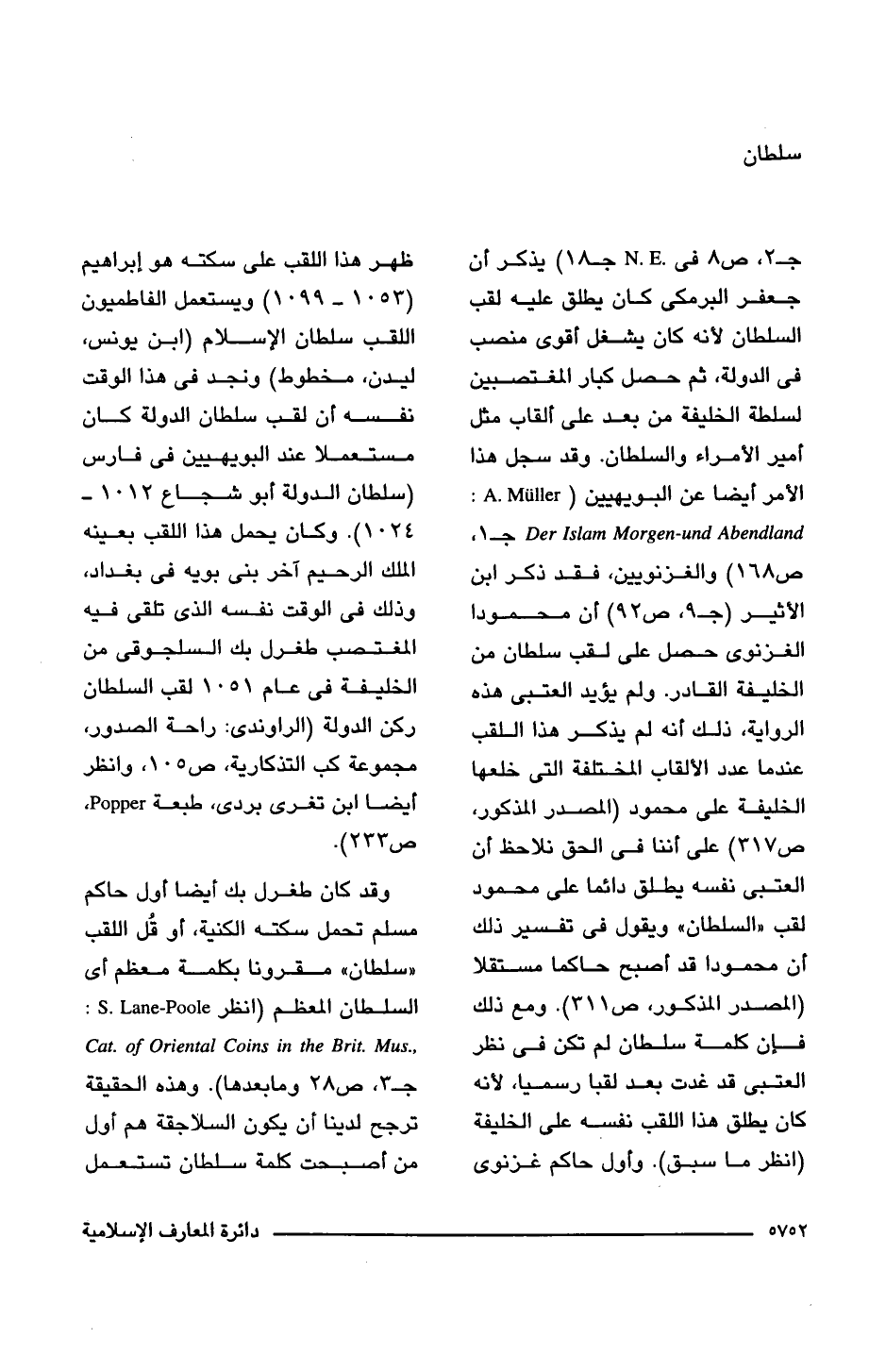 جـ 2، ص 8 فى N.E جـ 18) يذكر أن جعفر البرمكى كان يطلق عليه لقب السلطان لأنه كان يشغل أقوى منصب فى الدولة، ثم حصل كبار المغتصبين لسلطة الخليفة من بعد على ألقاب مثل أمير الأمراء والسلطان. وقد سجل هذا الأمر أيضا عن البويهيين (Der Islam Morgen-und Abendland: A.Muller جـ 1، ص 168) والغزنويين، فقد ذكر ابن الأثير (جـ 9، ص 92) أن محمودا الغزنوى حصل على لقب سلطان من الخليفة القادر. ولم يؤيد العتبى هذه الرواية، ذلك أنه لم يذكر هذا اللقب عندما عدد الألقاب المختلفة التى خلعها الخليفة على محمود (المصدر المذكور، ص 317) على أننا فى الحق نلاحظ أن العتبى نفسه يطلق دائما على محمود لقب "السلطان" ويقول فى تفسير ذلك أن محمودا قد أصبح حاكما مستقلا (المصدر المذكور، ص 311). مع ذلك فإن كلمة سلطان لم تكن فى نظر العتبى قد غدت بعد لقبا رسميا، لأنه كان يطلق هذا اللقب نفسه على الخليفة (انظر ما سبق). وأول حاكم غزنوى ظهر هذا اللقب على سكته هو إبراهيم (1053 - 1099) ويستعمل الفاطميون اللقب سلطان الإسلام (ابن يونس، ليدن، مخطوط) ونجد فى هذا الوقت نفسه أن لقب سلطان الدولة كان مستعملا عند البويهيين فى فارس (سلطان الدولة أبو شجاع 1012 - 1024). وكان يحمل هذا اللقب بعينه الملك الرحيم آخر بنى بويه فى بغداد، وذلك فى الوقت نفسه الذى نلقى فيه المغتصب طغرل بك السلجوقى من الخليفة فى عام 1051 لقب السلطان ركن الدولة (الراوندى: راحة الصدور، مجموعة كب التذكارية، ص 105، وانظر أيضا ابن تغرى بردى، طبعة Popper، ص 233).