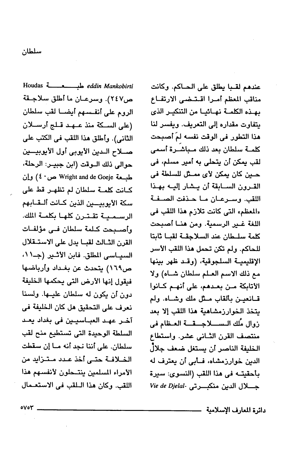 عندهم لقبا يطلق على الحاكم. وكانت مناقب المعظم أمرا اقتضى الارتفاع بهذه الكلمة نهائيا من التنكير الذى يتفاوت مقداره إلى التعريف. ويفسر لنا هذا التطور فى الوقت نفسه لِمَ أصبحت كلمة سلطان بعد ذلك مباشرة أسمى لقب يمكن أن يتحلى به أمير مسلم، فى حين كان يمكن لأى ممثل للسلطة فى القرون السابقة أن يشار إليه بهذا اللقب. وسرعان ما حذفت الصفة "المعظم" التى كانت تلازم هذا اللقب فى اللغة غير الرسمية. ومن هنا أصبحت كلمة سلطان عند السلاجقة لقبا ثابتا للحاكم. ولم تكن تحمل هذا اللقب الأسر الإقليمية السلجوقية، (وقد ظهر بينها مع ذلك الاسم العلم سلطان شاه) ولا الأتابكة من بعدهم، على أنهم كانوا قانعين بالقاب مثل ملك وشاه. ولم يتخذ الخوارزمشاهية هذا اللقب إلا بعد زوال مُلك السلاجقة العظام فى منتصف القرن الثانى عشر. واستطاع الخليفة الناصر أن يستغل ضعف جلال الدين خوارزمشاه، فأبى أن يعترف له بأحقيته فى هذا اللقب (النسوى: سيرة جلال الدين منكبرتى Vie de Djelaleddin Manknbirti طبعة Houdas ص 247). وسرعان ما أطلق سلاجقة الروم على أنفسهم أيضا لقب سلطان (على السكة منذ عهد قلج أرسلان الثانى). وأطلق هذا اللقب فى الكتب على صلاح الدين الأيوبى أول الأيوبيين حوالى ذلك الوقت (ابن جبير: الرحلة، طبعة Wright and de Goeje، ص 40) وإن كانت كلمة سلطان لم تظهر قط على سكة الأيوبيين الذين كانت ألقابهم الرسمية تقترن كلها بكلمة الملك. وأصبحت كلمة سلطان فى مؤلفات القرن الثالث لقبا يدل على الاستقلال السياسى المطلق. فابن الأثير (جـ 11، ص 169) يتحدث عن بغداد وأرباضها فيقول إنها الأرض التى يحكمها الخليفة دون أن يكون له سلطان عليها. ولسنا نعرف على التحقيق هل كان الخليفة فى آخر عهد العباسيين فى بغداد يعد السلطة الوحيدة التى تستطيع منح لقب سلطان. على أننا نجد أنه ما إن سقطت الخلافة حتى أخذ عدد متزايد من الأمراء المسلمين ينتحلون لأنفسهم هذا اللقب. وكان هذا اللقب فى الاستعمال