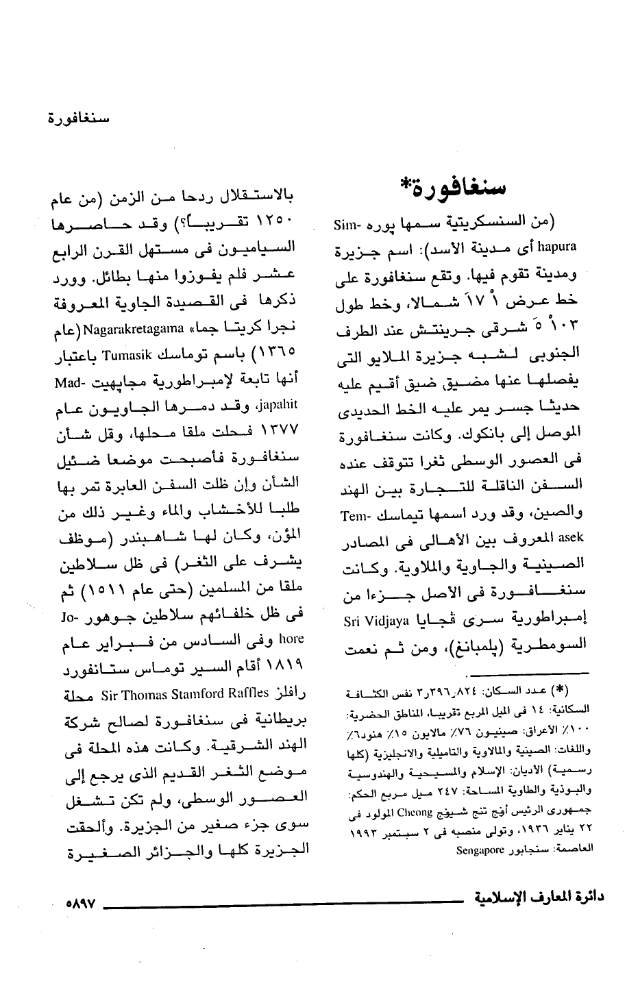 (من السنسكريتية سمها بوره Simhapura أى مدينة الأسد): اسم جزيرة ومدينة تقوم فيها. وتقع سنغافورة على خط عرض 1 ْ 17 َ شمالا، وخط طول 103 ْ 5 َ شرقى جرينتش عند الطرف الجنوبى لشبه جزيرة الملايو التى يفصلها عنها مضيق ضيق أقيم عليه حديثا جسر يمر عليه الخط الحديدى الموصل إلى بانكوك. وكانت سنغافورة فى العصور الوسطى ثغرا تتوقف عنده السفن الناقلة للتجارة بين الهند والصين، وقد ورد اسمها تيماسك Temasek المعروف بين الأهالى فى المصادر الصينية والجاوية والملاوية. وكانت سنغافورة فى الأصل جزءا من إمبراطورية سرى فجايا Sri Vidjaya السومطرية (بلمبانغ)، ومن ثم نعمت بالاستقلال ردحا من الزمن (من عام 1250 تقريبا؟ ) وقد حاصرها السياميون فى مستهل القرن الرابع عشر فلم يفوزوا منها بطائل. وورد ذكرها فى القصيدة الجاوية المعروفة نجرا كريتا جما" Nagarakretagama (عام 1365) باسم توماسك Tumasik باعتبار أنها تابعة لإمبراطورية مجابهيت Madjapahit، وقد دمرها الجاويون عام 1377 فحلت ملقا محلها، وقل شأن سنغافورة فأصبحت موضعا ضئيل الشأن وإن ظلت السفن العابرة تمر بها طلبا للأخشاب والماء وغير ذلك من المؤن، وكان لها شاهبندر (موظف يشرف على الثغر) فى ظل سلاطين ملقا من المسلمين (حتى عام 1511) ثم فى ظل خلفائهم سلاطين جوهور Johore وفى السادس من فبراير عام 1819 أقام السير توماس ستانفورد رافلز Sir Thomas Stamford Raflles محلة بريطانية فى سنغافورة لصالح شركة الهند الشرقية. وكانت هذه المحلة فى موضع الثغر القديم الذى يرجع إلى العصور الوسطى، ولم تكن تشغل سوى جزء صغير من الجزيرة. وألحقت الجزيرة كلها والجزائر الصغيرة