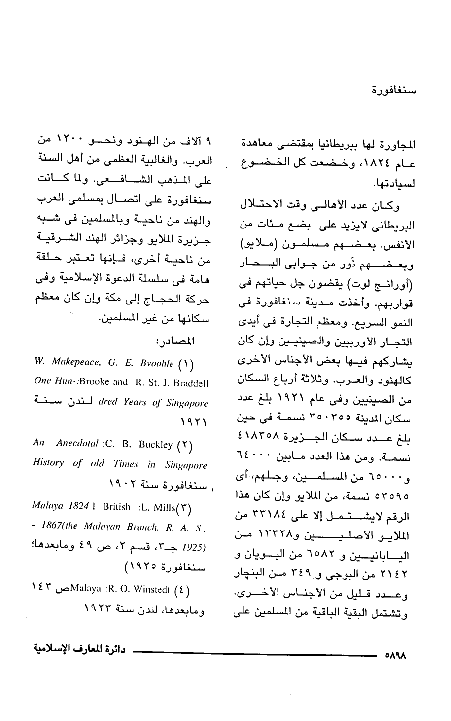 (1) W. Makepeace, G. E. Bvoolile One Hun-: Brooke and R. St. J.Braddell dred Years of Singapore، لندن سنة 1921
