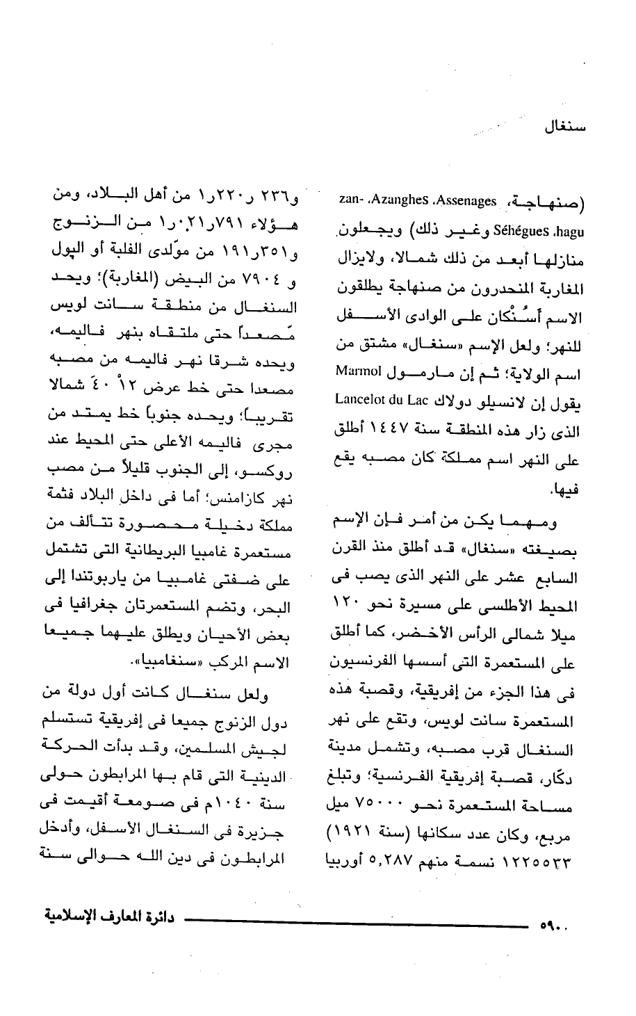 ومهما يكن من أمر فإن الإسم بصيغته "سنغال" قد أطلق منذ القرن السابع عشر على النهر الذى يصب فى المحيط الأطلسى على مسيرة نحو 120 ميلا شمالى الرأس الأخضر، كما أطلق على المستعمرة التى أسسها الفرنسيون فى هذا الجزء من إفريقية، وقصبة هذه المستعمرة سانت لويس، وتقع على نهر السنغال قرب مصبه , وتشمل مدينة دكّار, قصبة إفريقية الفرنسية؛ وتبلغ مساحة المستعمرة نحو 75000 ميل مربع, وكان عدد سكانها (سنة 1921) 1225533 نسمة منهم 5.287 أوربيا و 1.220.236 من أهل البلاد، ومن هؤلاء 1.021.791 من الزنوج و 191.351 من موّلدى الفلبة أو البول و 7904 من البيض (المغاربة)؛ ويحد السنغال من منطقة سانت لويس مصعدًا حتى ملتقاه بنهر فاليمه، ويحده شرقا نهر فاليمه من مصبه مصعدا حتى خط عرض 12 ْ 40 َ شمالا تقريبًا؛ ويحده جنوبًا خط يمتد من مجرى فاليمه الأعلى حتى المحيط عند روكسو، إلى الجنوب قليلًا من مصب نهر كازامنس؛ أما فى داخل البلاد فثمة مملكة دخيلة محصورة تتألف من مستعمرة غامبيا البريطانية التى تشتمل على ضفتى غامبيا من ياربوتندا إلى البحر، وتضم المستعمرتان جغرافيا فى بعض الأحيان ويطلق عليهما جميعا الاسم المركب "سنغامبيا".