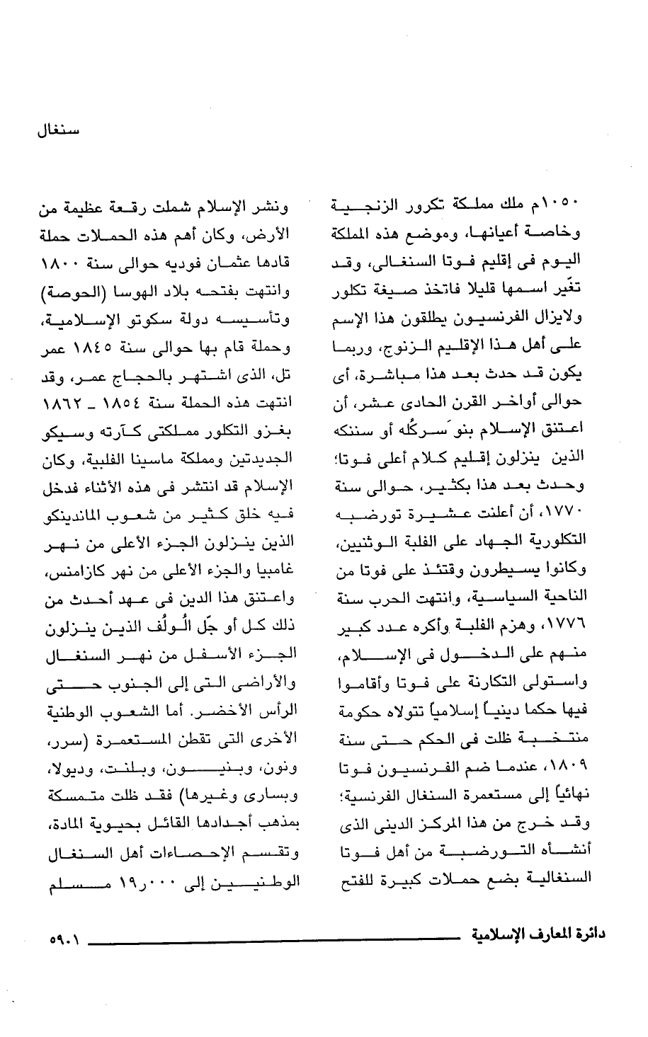 1050 م ملك مملكة تكرور الزنجية وخاصة أعيانها، وموضع هذه المملكة اليوم فى إقليم فوتا السنغالى، وقد تغيّر اسمها قليلا فاتخذ صيغة تكلور ولا يزال الفرنسيون يطلقون هذا الإسم على أهل هذا الإقليم الزنوج، وربما يكون قد حدث بعد هذا مباشرة، أى حوالى أواخر القرن الحادى عشر، أن اعتنق الإسلام بنو سَركُله أو سننكه الذين ينزلون إقليم كلام أعلى فوتا؛ وحدث بعد هذا بكثير، حوالى سنة 1770، أن أعلنت عشيرة تورضبه التكلورية الجهاد على الفلبة الوثنيين، وكانوا يسيطرون وقتئذ على فوتا من الناحية السياسية، وانتهت الحرب سنة 1776 وهزم الفلبة وأكره عدد كبير منهم على الدخول فى الإسلام، واستولى التكارنة على فوتا وأقاموا فيها حكما دينيًا إسلاميًا تتولاه حكومة منتخبة ظلت فى الحكم حتى سنة 1809، عندما ضم الفرنسيون فوتا نهائيًا إلى مستعمرة السنغال الفرنسية؛ وقد خرج من هذا المركز الدينى الذى أنشأه التورضبة من أهل فوتا السنغالية بضع حملات كبيرة للفتح ونشر الإسلام شملت رقعة عظيمة من الأرض، وكان أهم هذه الحملات حملة قادها عثمان فوديه حوالى سنة 1800 وانتهت بفتحه بلاد الهوسا (الحوصة) وتأسيسه دولة سكوتو الإسلامية، وحملة قام بها حوالى سنة 1845 عمر تل، الذى اشتهر بالحجاج عمر، وقد انتهت هذد الحملة سنة 1854 - 1862 بغزو التكلور مملكتى كآرته وسيكو الجديدتين ومملكة ماسينا الفلبية، وكان الإسلام قد انتشر فى هذه الأثناء فدخل فيه خلق كثير من شعوب الماندينكو الذين ينزلون الجزء الأعلى من نهر غامبيا والجزء الأعلى من نهر كازامنس، واعتنق هذا الدين فى عهد أحدث من ذلك كل أو جل الولف الذين ينزلون الجزء الأسفل من نهر السنغال والأراضى التى إلى الجنوب حتى الرأس الأخضر. أما الشعوب الوطنية الأخرى التى تقطن المستعمرة (سرر، ونون، وبنيون، وبلنت، وديولا، وبسارى وغيرها) فقد ظلت متمسكة بمذهب أجدادها القائل بحيوية المادة، وتقسم الإحصاءات أهل السنغال الوطنيين إلى 19.000 مسلم