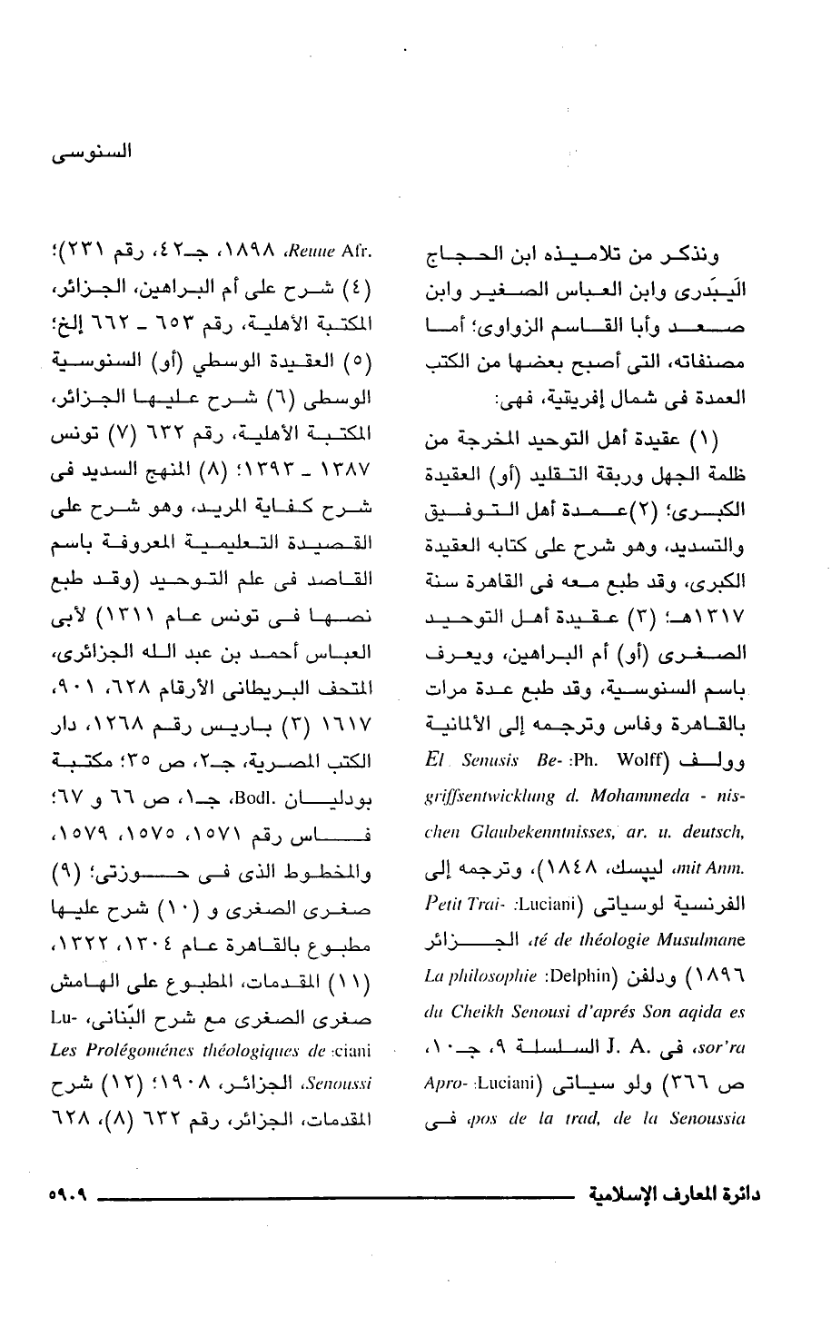 (1) عقيدة أهل التوحيد المخرجة من ظلمة الجهل وربقة التقليد (أو) العقيدة الكبرى؛ (2) عمدة أهل التوفيق والتسديد، وهو شرح على كتابه العقيدة الكبرى، وقد طبع معه فى القاهرة سنة 1317 هـ (3) عقيدة أهل التوحيد الصغرى (أو) أم البراهين، ويعرف باسم السنوسية، وقد طبع عدة مرات بالقاهرة وفاس وترجمه إلى الألمانية وولف (El .Senusis B-greffsentwicklung d. Mohammeda - nischen Glaubekenntnisses, ar. u.deutsch mit Anm: Ph. Wolff، ليبسك 1848)، وترجمه إلى الفرنسية لوسياتى (Petit Traite de theologie Musulmane: Luciani, الجزائر 1896) دلفن (La philosophie de Cheikh Senousi d'apres Son aqida es sor'ra: Delphin, فى J.A السلسلة 9، جـ 10, ص 366) ولو سياتى (Apropos de la trad, de la Senoussia: Luciani, فى Reune Afr 1998، جـ 42، رقم 231)؛ (4) شرح على أم البراهين، الجزائر، المكتبة الأهلية، رقم 653 - 662 إلخ؛ (5) العقيدة الوسطى (أو) السنوسية الوسطى (6) شرح عليها الجزائر، المكتبة الأهلية، رقم 632 (7) تونس 1387 - 1393؛ (8) المنهج السديد فى شرح كفاية المريد، وهو شرح على القصيدة التعليمية المعروفة باسم القاصد فى علم التوحيد (وقد طبع نصها فى تونس عام 1311) لأبى العباس أحمد بن عبد اللَّه الجزائرى، المتحف البريطانى الأرقام 628, 901, 1617 (3) باريس رقم 1268, دار الكتب المصرية، جـ 2، ص 35؛ مكتبة بودليان Bodl، جـ 1، ص 66 و 67؛ فاس رقم 1571، 1575, 1579, والمخطوط الذى فى حوزتى؛ (9) صغرى الصغرى و (10) شرح عليها مطبوع بالقاهرة عام 1304, 1322, (11) المقدمات، المطبوع على الهامش صغرى الصغرى مع شرح البنانى، Lu Les Prolegomenes theologiques de: ciani Senoussi، الجزائر، 1908 (12) شرح المقدمات، الجزائر، رقم 632 (8)، 628