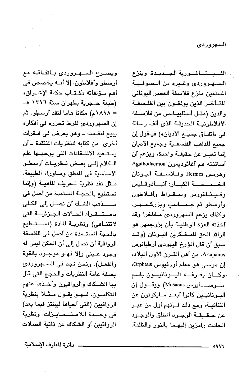 الفيثاغورية الجديدة. وينزع السهروردى وغيره من الصوفية المسلمين منزع فلاسفة العصر اليونانى المتأخر الذين يوفقون بين الفلسفة والدين (مثل أسقلبيادس من فلاسفة الأفلاطونية الحديثة الذى ألف رسالة فى "اتفاق جميع الأديان") فيقول إن جميع المذاهب الفلسفية وجميع الأديان إنما تعبر عن حقيقة واحدة، ويزعم أن أساتذته هم أغاثوديمون Agathodaemon وهرمس Hermes وفلاسفة اليونان الخمسة الكبار: أنباذوقليس وفيثاغورس وسقراط وأفلاطون وأرسطو ثم جماسب وبزركمهر. وكذلك يزعم السهروردى مفاخرا وقد أخذته العزة الوطنية بأن بزرجمهر هو الرائد الحق للمفكرين اليونان (وقد سبق أن قال المؤرخ اليهودى أرطبانوس Artapanus من أهل القرن الأول الميلاد، إن موسى هو معلم أورفيوس Orpheus, وكان يعرفه اليونانيون باسم موسايوس Musaeus) ويقول إن اليونانيين كانوا أبعد ما يكونون عن الثنائية، ومع ذلك فإنهم أول من عبر عن حقيقة الوجود المطلق والوجود الحادث رامزين إليهما بالنور والظلمة. ويصرح السهروردى باتفاقه مع أرسطو وأفلاطون، إلا أنه يخصص فى أهم مؤلفاته "كتاب حكمة الاشراق" (طبعة حجرية بطهران سنة 1316 هـ = 1898 م) مكانا هاما لنقد أرسطو. ثم إن السهروردى لفرط تحرره فى أفكاره يبيح لنفسه -وهو يعرض فى فقرات أخرى من كتابه للنظريات المنتقدة- أن يستعيد الانتقادات التى يوجهها علم الكلام إلى بعض نظريات أرسطو الأساسية فى المنطق وما وراء الطبيعة، مثل نقد نظرية تعريف الماهية (وإنما نستطيع بالحجة المستمدة من أصل فى مذهب الشك أن نصل إلى الكلى باستقراء الحالات الجزئية التى لا تتناهى) ونظرية المادة (نستطيع بالحجة المستمدة من أصل فى الفلسفة الرواقية أن نصل إلى أن الممكن ليس له وجود عينى وإلا فهو موجود بالقوة والفعل). ونحن نجد فى السهروردى بصفة عامة النظريات والحجج التى قال بها الشكاك والرواقيون وأخذها عنهم المتكلمون، فهو يقول مثلا بنظرية الرواقيين (التى أحياها ليبنتز فيما بعد) فى وحدة اللامتمايزات، ونظرية الرواقيين أو الشكاك عن ذاتية الصلات