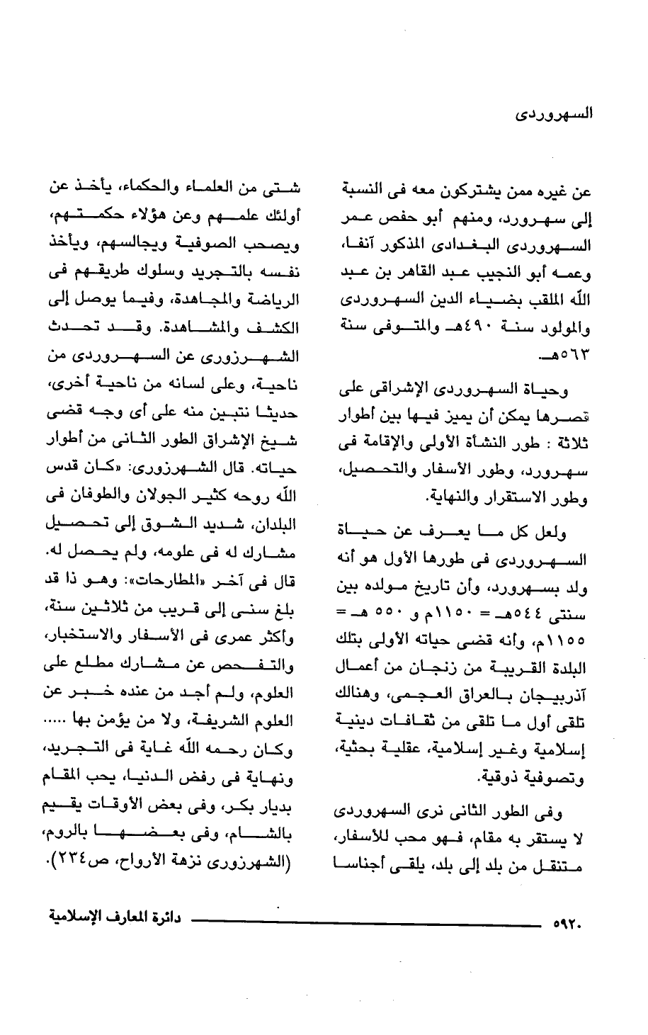 وحياة السهروردى الإشراقى على قصرها يمكن أن يميز فيها بين أطوار ثلاثة: طور النشأة الأولى والإقامة فى سهرورد، وطور الأسفار والتحصيل، وطور الاستقرار والنهاية.