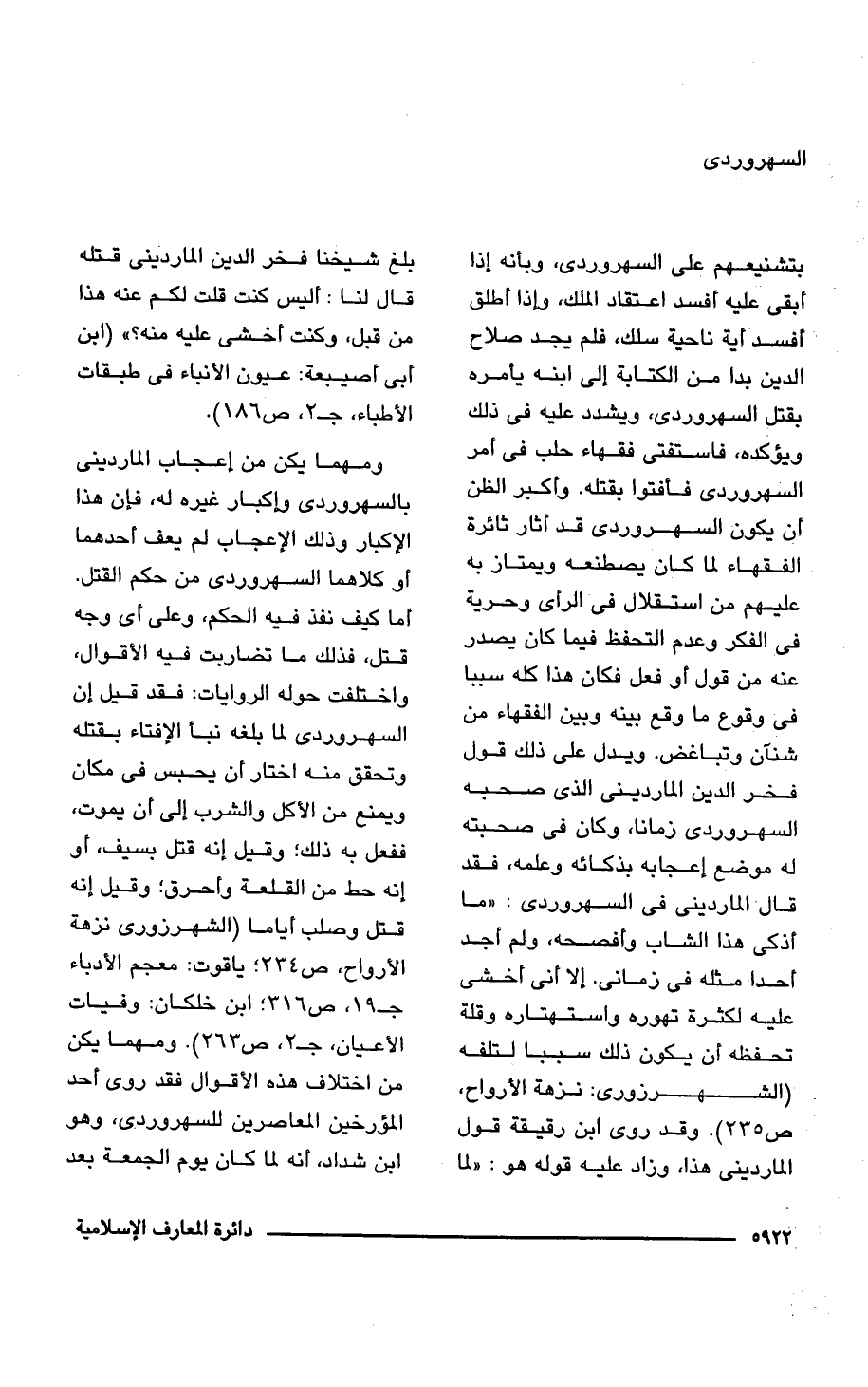 بتشنيعهم على السهروردى، وبأنه إذا أبقى عليه أفسد اعتقاد الملك، وإذا أطلق أفسد أية ناحية سلك، فلم يجد صلاح الدين بدا من الكتابة إلى ابنه يأمره بقتل السهروردى، ويشدد عليه فى ذلك ويؤكده، فاستفتى فقهاء حلب فى أمر السهروردى فأفتوا بقتله. وأكبر الظن أن يكون السهروردى قد أثار ثائرة الفقهاء لما كان يصطنعه ويمتاز به عليهم من استقلال فى الرأى وحرية فى الفكر وعدم التحفظ فيما كان يصدر عنه من قول أو فعل فكان هذا كله سببا فى وقوع ما وقع بينه وبين الفقهاء من شنآن وتباغض. ويدل على ذلك قول فخر الدين الماردينى الذى صحبه السهروردى زمانا، وكان فى صحبته له موضع إعجابه بذكائه وعلمه، فقد قال الماردينى فى السهروردى: "ما أذكى هذا الشاب وأفصحه، ولم أجد أحدا مثله فى زمانى. إلا أنى أخشى عليه لكثرة تهوره واستهتاره وقلة تحفظه أن يكون ذلك سببا لتلفه (الشهرزورى: نزهة الأرواح، ص 235). وقد روى ابن رقيقة قول الماردينى هذا، وزاد عليه قوله هو: "لما بلغ شيخنا فخر الدين الماردينى قتله قال لنا: أليس كنت قلت لكم عنه هذا من قبل، وكنت أخشى عليه منه؟ " (ابن أبى أصيبعة: عيون الأنباء فى طبقات الأطباء، جـ 3، ص 186).