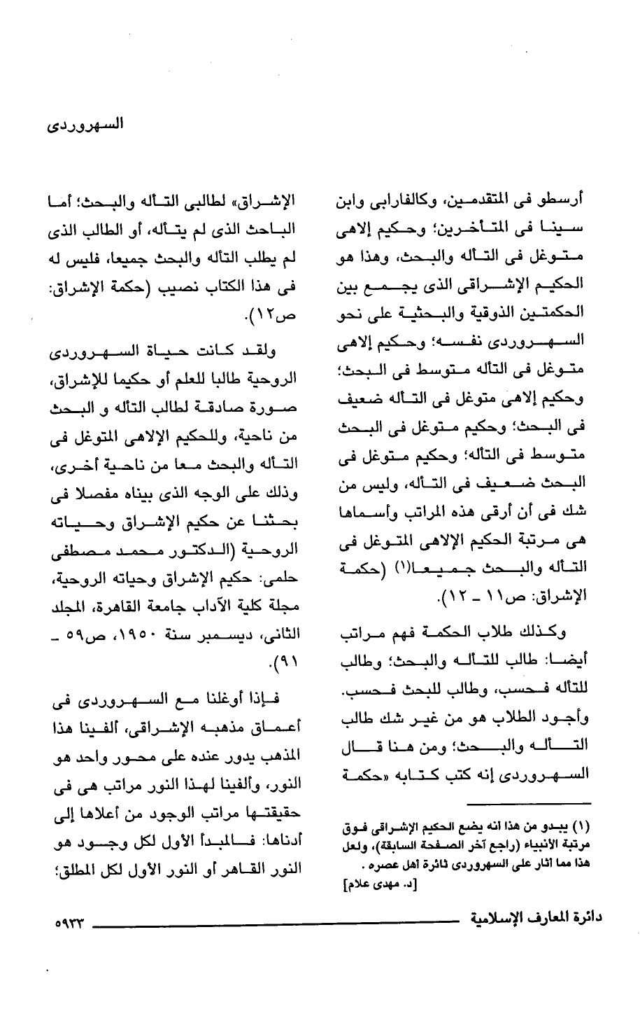 ولقد كانت حياة السهروردى الروحية طالبا للعلم أو حكيما للإشراق، صورة صادقة لطالب التأله والبحث من ناحية، وللحكيم الإلاهى المتوغل فى التأله والبحث معا من ناحية أخرى، وذلك على الوجه الذى بيناه مفصلا فى بحثنا عن حكيم الإشراق وحياته الروحية (الدكتور محمد مصطفى حلمى: حكيم الإشراق وحياته الروحية، مجلة كلية الآداب جامعة القاهرة، المجلد الثانى، ديسمبر سنة 1950, ص 59 - 91).