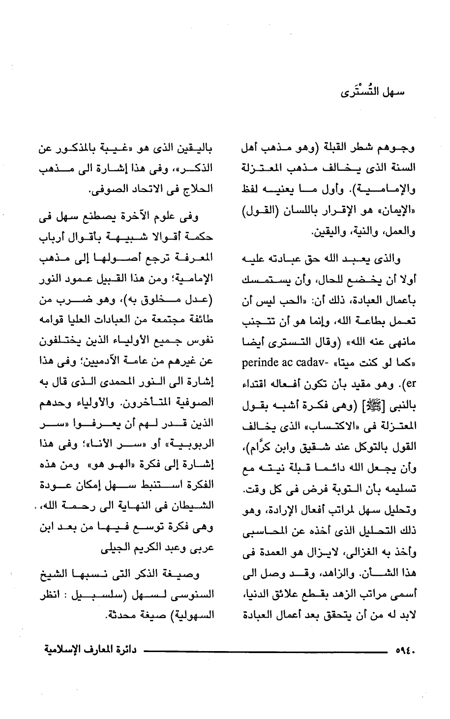 والذى يعبد اللَّه حق عبادته عليه أولا أن يخضع للحال، وأن يستمسك بأعمال العبادة، ذلك أن: "الحب ليس أن تعمل بطاعة اللَّه، وإنما هو أن تتجنب ما نهى عنه اللَّه" (وقال التسترى أيضا "كما لو كنت ميتا" perinde ac cadaver). وهو مقيد بأن تكون أفعاله اقتداء بالنبى [-صلى اللَّه عليه وسلم-] (وهى فكرة أشبه بقول المعتزلة فى "الاكتساب" الذى يخالف القول بالتوكل عند شقيق وابن كرام)، وأن يجعل اللَّه دائما قبلة نيته مع تسليمه بأن التوبة فرض فى كل وقت. وتحليل سهل لمراتب أفعال الإرادة، وهو ذلك التحليل الذى أخذه عن المحاسبى وأخذ به الغزالى، لا يزال هو العمدة فى هذا الشأن. والزاهد، وقد وصل إلى أسمى مراتب الزهد بقطع علائق الدنيا، لابد له من أن يتحقق بعد أعمال العبادة باليقين الذى هو "غيبة بالمذكور عن الذكر"، وفى هذا إشارة إلى مذهب الحلاج فى الاتحاد الصوفى.