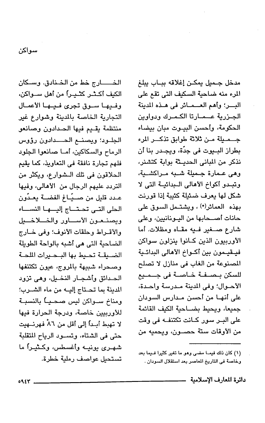 مدخل جميل يمكن إغلاقه بباب يبلغ المرء منه ضاحية السكيف التى تقع على البر؛ وأهم العمائر فى هذه المدينة الجزرية عمارتا الكمرك ودواوين الحكومة، وأحسن البيوت مبان بيضاء جميلة من ثلاثة طوابق تذكر المرء بطراز البيوت فى جدّة، ويجدر بنا أن نذكر من المبانى الحديثة بوابة كتشنر، وهى عمارة جميلة شبه مراكشية، وتبدو أكواخ الأهالى البدائية التى لا شكل لها يعرف ضئيلة كئيبة إذا قورنت بهذه العمائر (¬1)، ويشتمل السوق على حانات أصحابها من اليونانيين، وعلى شارع صغير فيه مقاه ومظلات. أما الأوربيون الذين كانوا ينزلون سواكن فيقيمون بين أكواخ الأهالى البدائية المصنوعة من الغاب فى منازل لا تصلح للسكن بصفة خاصة فى جميع الأحوال؛ وفى المدينة مدرسة واحدة، على أنها من أحسن مدارس السودان جميعا، ويحيط بضاحية الكيف القائمة على البر سور كانت تكتنفه فى وقت من الأوقات ستة حصون، ويحميه من الخارج خط من الخنادق. وسكان الكيف أكثر كثيرًا من أهل سواكن، وفيها سوق تجرى فيها الأعمال التجارية الخاصة بالمدينة وشوارع غير منتظمة يقيم فيها الحدادون وصانعو الجلود؛ ويصنع الحدادون رؤوس الرماح والسكاكين، أما صانعوا الجلود فلهم تجارة نافقة فى التعاويذ، كما يقيم الحلاقون فى تلك الشوارع، ويكثر من التردد عليهم الرجال من الأهالى، وفيها عدد قليل من صيّاغ الفضة يعدّون الحلى التى تحتاج إليها النساء ويصنعون الأساور والخلاخيل والأقراط وحلقات الأنوف؛ وفى خارج الضاحية التى هى أشبه بالواحة الطويلة الضيقة تحيط بها البحيرات الملحة وصحراء شبيهة بالمروج، عيون تكتنفها الحدائق وأشجار النخيل، وهى تزود المدينة بما تحتاج إليه من ماء الشرب؛ ومناخ سواكن ليس صحيًا بالنسبة للأوربيين خاصة، ودرجة الحرارة فيها لا تهبط أبدًا إلى أقل من 86 فهرنهيت حتى فى الشتاء، وتسود الرياح المتقلبة شهرى يونيه وأغسطس، وكثيرًا ما تستحيل عواصف رملية خطرة.