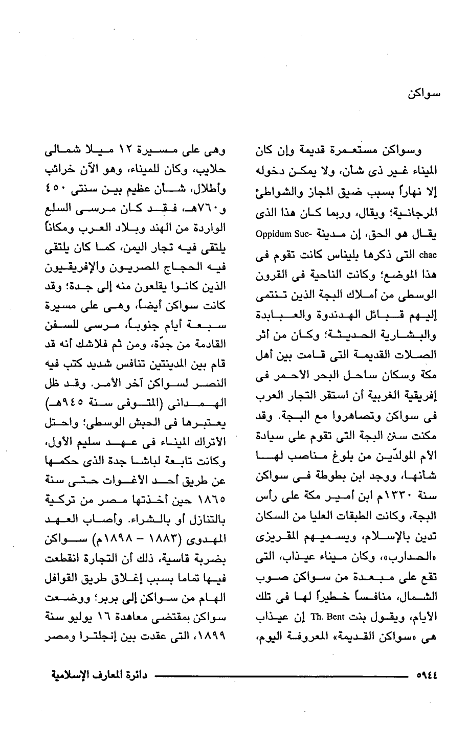 وسواكن مستعمرة قديمة وإن كان الميناء غير ذى شأن، ولا يمكن دخوله إلا نهارًا بسبب ضيق المجاز والشواطئ المرجانية؛ ويقال، وربما كان هذا الذى يقال هو الحق، إن مدينة Oppidum Succhae التى ذكرها بليناس كانت تقوم فى هذا الموضع؛ وكانت الناحية فى القرون الوسطى من أملاك البجة الذين تنتمى إليهم قبائل الهدندوة والعبابدة والبشارية الحديثة؛ وكان من أثر الصلات القديمة التى قامت بين أهل مكة وسكان ساحل البحر الأحمر فى إفريقية الغربية أن استقر التجار العرب فى سواكن وتصاهروا مع البجة. وقد مكنت سنن البجة التى تقوم على سيادة الأم المولدّين من بلوغ مناصب لها شأنها، ووجد ابن بطوطة فى سواكن سنة 1330 م ابن أمير مكة على رأس البجة، وكانت الطبقات العليا من السكان تدين بالإسلام، ويسميهم المقريزى "الحدارب"، وكان ميناء عيذاب، التى تقع على مبعدة من سواكن صوب الشمال، منافسًا خطيرًا لها فى تلك الأيام، ويقول بنت Th.Bent إن عيذاب هى "سواكن القديمة" المعروفة اليوم, وهى على مسيرة 12 ميلا شمالى حلايب، وكان للميناء، وهو الآن خرائب وأطلال، شأن عظيم بين سنتى 450 و 760 هـ، فقد كان مرسى السلع الواردة من الهند وبلاد العرب ومكانًا يلتقى فيه تجار اليمن، كما كان يلتقى فيه الحجاج المصريون والإفريقيون الذين كانوا يقلعون منه إلى جدة؛ وقد كانت سواكن أيضا، وهى على مسيرة سبعة أيام جنوبًا، مرسى للسفن القادمة من جدّة، ومن ثم فلاشك أنه قد قام بين المدينتين تنافس شديد كتب فيه النصر لسواكن آخر الأمر. وقد ظل الهمدانى (المتوفى سنة 945 هـ) يعتبرها فى الحبش الوسطى؛ واحتل الأتراك الميناء فى عهد سليم الأول، وكانت تابعة لباشا جدة الذى حكمها عن طريق أحد الأغوات حتى سنة 1865 حين أخذتها مصر من تركية بالتنازل أو بالشراء. وأصاب العهد المهدوى (1883 - 1898 م) سواكن بضربة قاسية، ذلك أن التجارة انقطعت فيها تماما بسبب إغلاق طريق القوافل الهام من سواكن إلى بربر؛ ووضعت سواكن بمقتضى معاهدة 16 يوليو سنة 1899, التى عقدت بين إنجلترا ومصر
