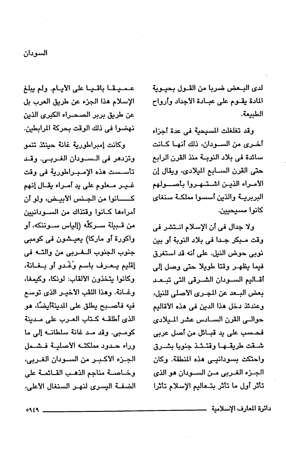 ولا جدال فى أن الإسلام انتشر فى وقت مبكر جدا فى بلاد النوبة أو بين نوبى حوض النيل. على أنه قد استغرق فيما يظهر وقتا طويلا حتى وصل إلى أقاليم السودان الشرقى التى تبعد بعض البعد عن المجرى الأصلى للنيل، وعندئذ دخل هذا الدين فى هذه الأقاليم حوالى القرن السادس عشر الميلادى فحسب على يد قبائل من أصل عربى شقت طريقها وقتئذ جنوبا بشرق واحتكت بسودانيى هذه المنطقة. وكان الجزء الغربى من السودان هو الذى تأثر أول ما تأثر بتعاليم الإسلام تاثرا عميقا باقيا على الأيام. ولم يبلغ الإسلام هذا الجزء عن طريق العرب بل عن طريق بربر الصحراء الكبرى الذين نهضوا فى ذلك الوقت بحركة المرابطين.