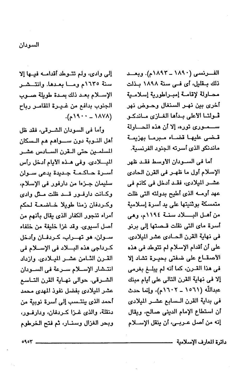وأما فى السودان الشرقى، فقد ظل أهل النوبة دون سواهم هم السكان المسلمين حتى القرن السادس عشر الميلادى. وفى هذه الأيام أدخل رأس أسرة حاكمة جديدة يدعى سولن سليمان جزءا من دارفور فى الإسلام، وكانت دارفور قد ظلت مثل وادى وكردفان زمنا طويلا خاضعة لحكم أمراء تنجور الكفار الذى يقال بأنهم من أصل آسيوى. وقد غزا خليفة من خلفاء سولن، هو تهراب، كردفان وأدخل كرداجى هذه البلاد فى الإسلام فى القرن الثامن عشر الميلادى. وازداد انتشار الإسلام سرعة فى السودان الشرقى. حوالى نهاية القرن التاسع عشر الميلادى بفضل نفوذ المهدى محمد أحمد الذى ينتسب إلى أسرة نوبية من دنقلة، والذى غزا كردفان، ودارفور، وبحر الغزال وسنار، ثم فتح الخرطوم