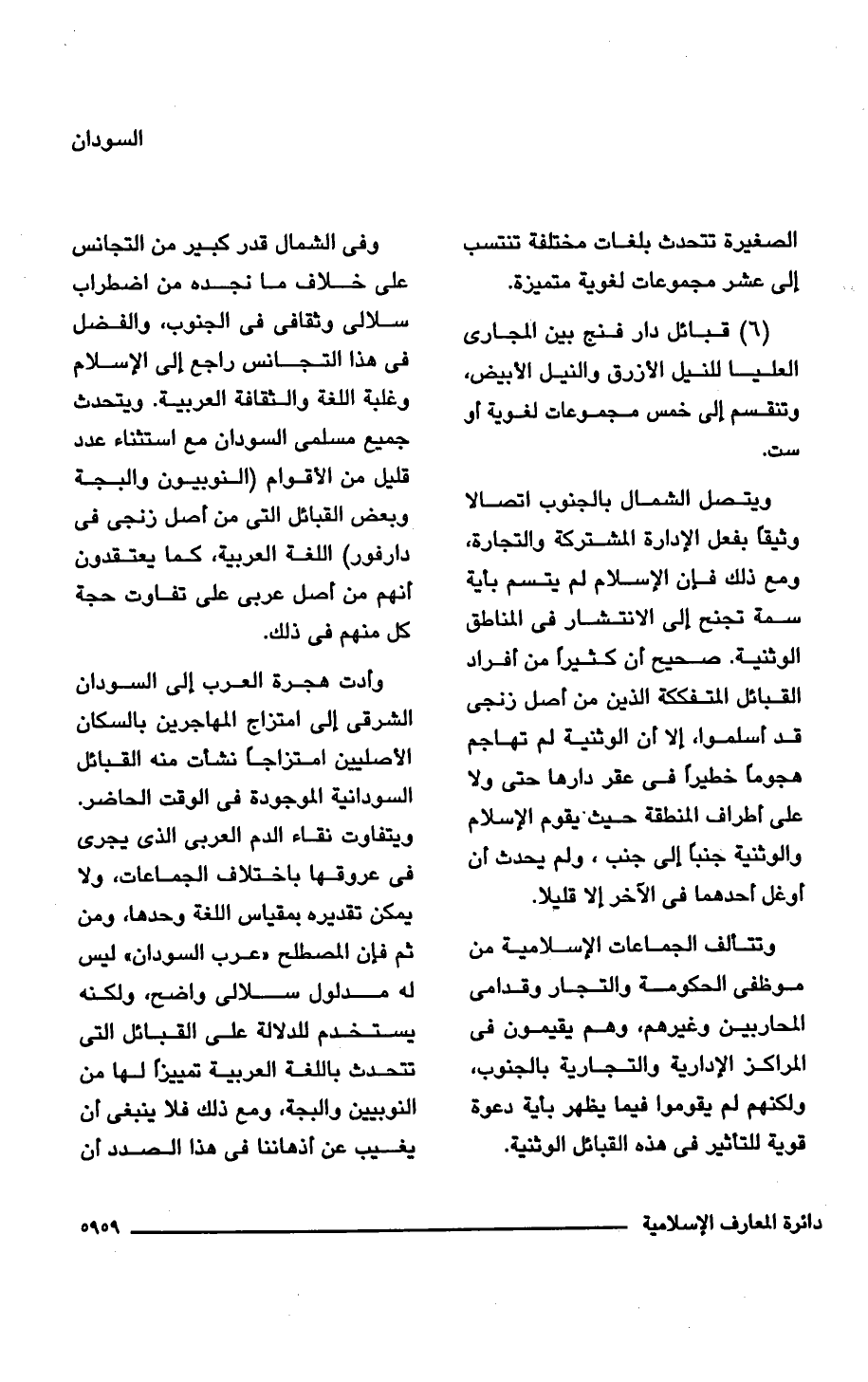 وفى الشمال قدر كبير من التجانس على خلاف ما نجده من اضطراب سلالى وثقافى فى الجنوب، والفضل فى هذا التجانس راجع إلى الإسلام وغلبة اللغة والثقافة العربية. ويتحدث جميع مسلمى السودان مع استثناء عدد قليل من الأقوام (النوبيون والبجة وبعض القبائل التى من أصل زنجى فى دارفور) اللغة العربية، كما يعتقدون أنهم من أصل عربى على تفاوت حجة كل منهم فى ذلك.