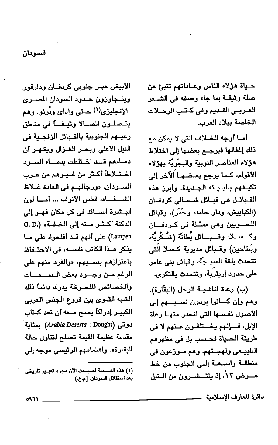 (ب) رعاة الماشية الرحل (البقّارة). وهم وإن كانوا يردون نسبهم إلى الأصول نفسها التى انحدر منها رعاة الإبل، فإنهم يختلفون عنهم لا فى طريقة الحياة فحسب بل فى مظهرهم الطبيعى ولهجتهم. وهم موزعون فى منطقة واسعة إلى الجنوب من خط عرض 13، إذ ينتشرون من النيل الأبيض عبر جنوبى كردفان ودارفور ويتجاوزون حدود السودان المصرى الإنجليزى (¬1) حتى واداى وبُرنو. وهم يتصلون اتصالا وثيقًا فى مناطق رعيهم الجنوبية بالقبائل الزنجية فى النيل الأعلى وبحر الغزال ويظهر أن دماءهم قد اختلطت بدماء السود اختلاطًا أكثر من غيرهم من عرب السودان. "ورجالهم فى العادة غلاظ الشفاه، فطس الأنوف. . . أما لون البشرة السائد فى كل مكان فهو إلى الدكنة أكثر منه إلى الخفة" (G.D.Lampen) على أنهم قد أفلحوا، على ما يذكر هذا الكاتب نفسه، فى الاحتفاظ باعتزازهم بنسبهم، "والفرد منهم على الرغم من وجود بعض السمات والخصائص الملحوظة يدرك دائمًا ذلك الشبه القوى بين فروع الجنس العربى الكبير إدراكًا يصح معه أن نعد كتاب دوتى (Arabia Deserta: Dought) بمثابة مقدمة عظيمة القيمة تصلح لتناول حالة البقارة". واهتمامهم الرئيسى موجه إلى