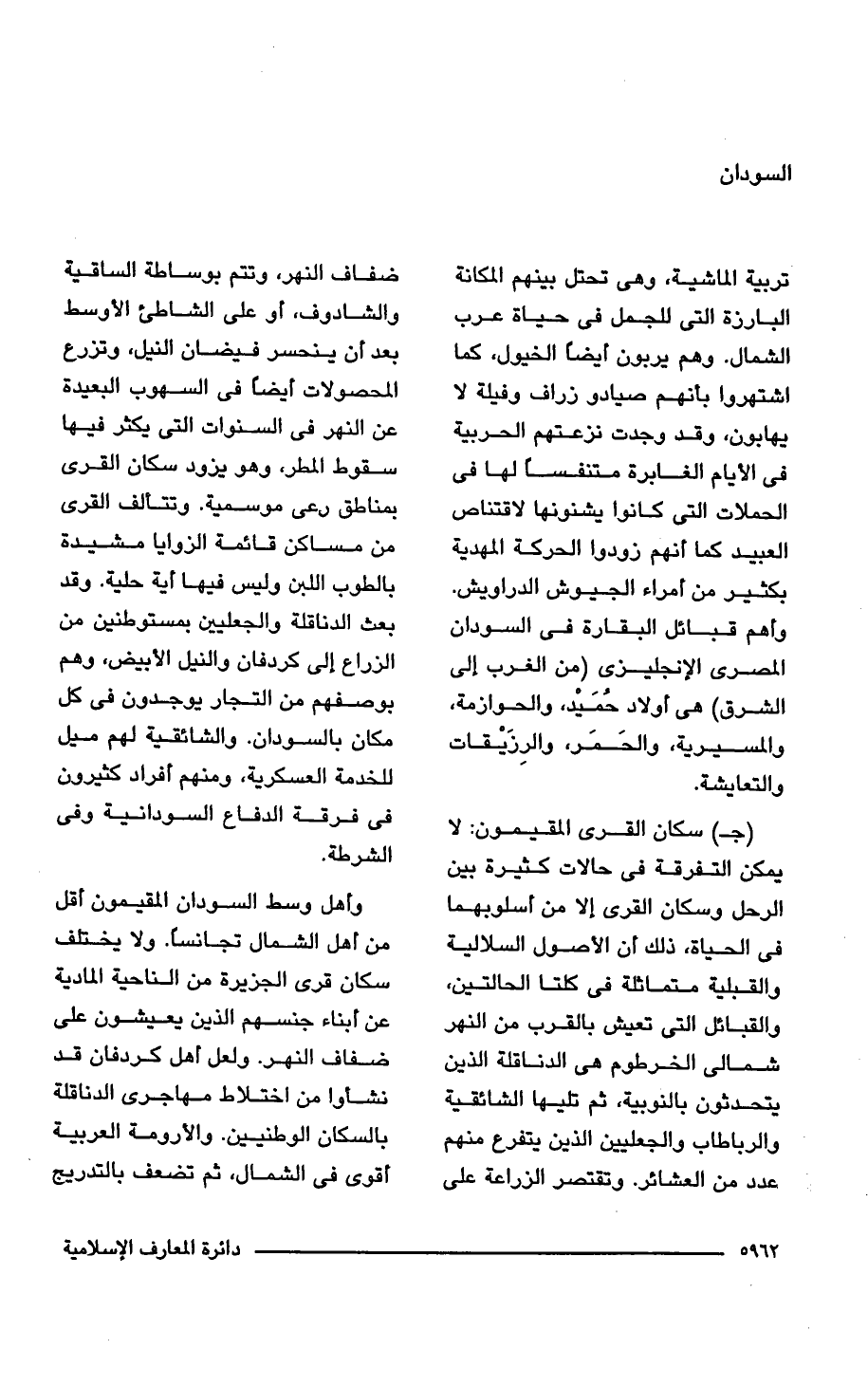 (جـ) سكان القرى المقيمون: لا يمكن التفرقة فى حالات كثيرة بين الرحل وسكان القرى إلا من أسلوبهما فى الحياة، ذلك أن الأصول السلالية والقبلية متماثلة فى كلتا الحالتين، والقبائل التى تعيش بالقرب من النهر شمالى الخرطوم هى الدناقلة الذين يتحدثون بالنوبية، ثم تليها الشائقية والرباطاب والجعليين الذين يتفرع منهم عدد من العشائر. وتقتصر الزراعة على ضفاف النهر، وتتم بوساطة الساقية والشادوف، أو على الشاطئ الأوسط بعد أن ينحسر فيضان النيل، وتزرع المحصولات أيضًا فى السهوب البعيدة عن النهر فى السنوات التى يكثر فيها سقوط المطر، وهو يزود سكان القرى بمناطق رعى موسمية. وتتألف القرى من مساكن قائمة الزوايا مشيدة بالطوب اللبن وليس فيها أية حلية. وقد بعث الدناقلة والجعليين بمستوطنين من الزراع إلى كردفان والنيل الأبيض، وهم بوصفهم من التجار يوجدون فى كل مكان بالسودان. والشائقية لهم ميل للخدمة العسكرية، ومنهم أفراد كثيرون فى فرقة الدفاع السودانية وفى الشرطة.