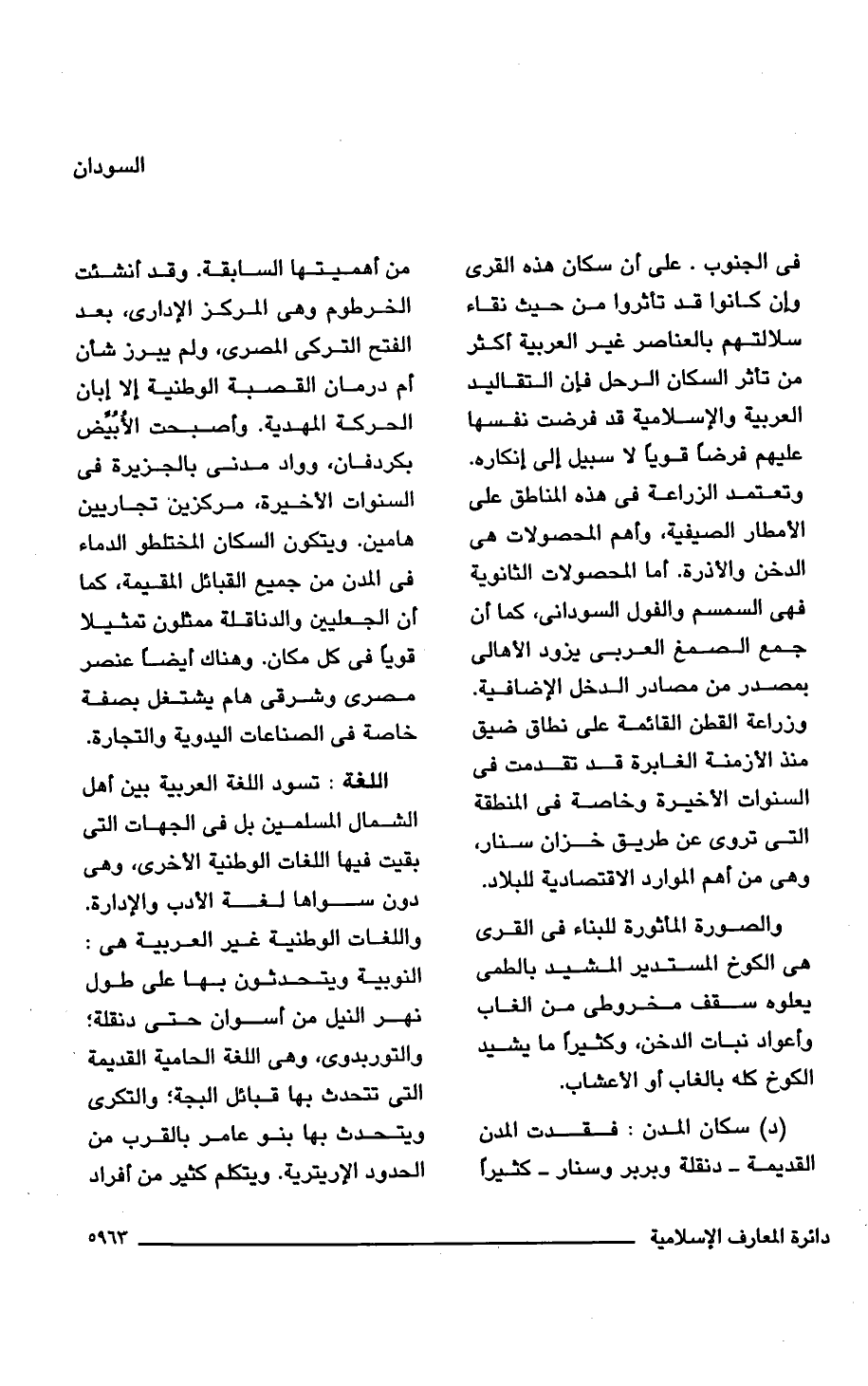 فى الجنوب. على أن سكان هذه القرى وإن كانوا قد تأثروا من حيث نقاء سلالتهم بالعناصر غير العربية أكثر من تأثر السكان الرحل فإن التقاليد العربية والإسلامية قد فرضت نفسها عليهم فرضًا قويًا لا سبيل إلى إنكاره. وتعتمد الزراعة فى هذه المناطق على الأمطار الصيفية، وأهم المحصولات هى الدخن والأذرة. أما المحصولات الثانوية فهى السمسم والفول السودانى، كما أن جمع الصمغ العربى يزود الأهالى بمصدر من مصادر الدخل الإضافية. وزراعة القطن القائمة على نطاق ضيق منذ الأزمنة الغابرة قد تقدمت فى السنوات الأخيرة وخاصة فى المنطقة التى تروى عن طريق خزان سنار، وهى من أهم الموارد الإقتصادية للبلاد.