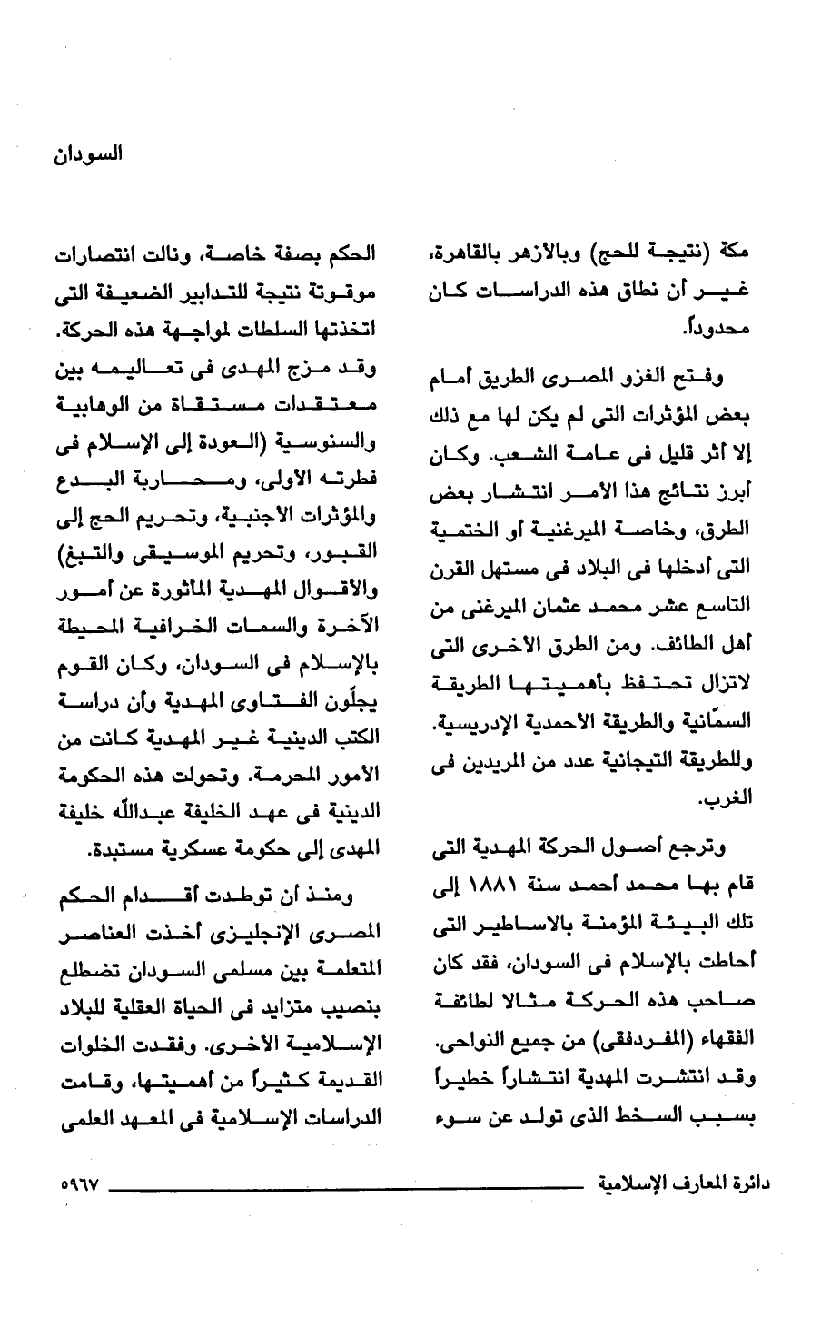 وترجع أصول الحركة المهدية التى قام بها محمد أحمد سنة 1881 إلى تلك البيئة المؤمنة بالأساطير التى أحاطت بالإسلام فى السودان، فقد كان صاحب هذه الحركة مثالا لطائفة الفقهاء (المفردفقى) من جميع النواحى. وقد انتشرت المهدية انتشارًا خطيرًا بسبب السخط الذى تولد عن سوء الحكم بصفة خاصة، ونالت انتصارات موقوتة نتيجة للتدابير الضعيفة التى اتخذتها السلطات لمواجهة هذه الحركة. وقد مزج المهدى فى تعاليمه بين معتقدات مستقاة من الوهابية والسنوسية (العودة إلى الإسلام فى فطرته الأولى، ومحاربة البدع والمؤثرات الأجنبية، وتحريم الحج إلى القبور، وتحريم الموسيقى والتبغ) والأقوال المهدية المأثورة عن أمور الآخرة والسمات الخرافية المحيطة بالإسلام فى السودان، وكان القوم يجلُّون الفتاوى المهدية وأن دراسة الكتب الدينية غير المهدية كانت من الأمور المحرمة. وتحولت هذه الحكومة الدينية فى عهد الخليفة عبد اللَّه خليفة المهدى إلى حكومة عسكرية مستبدة.