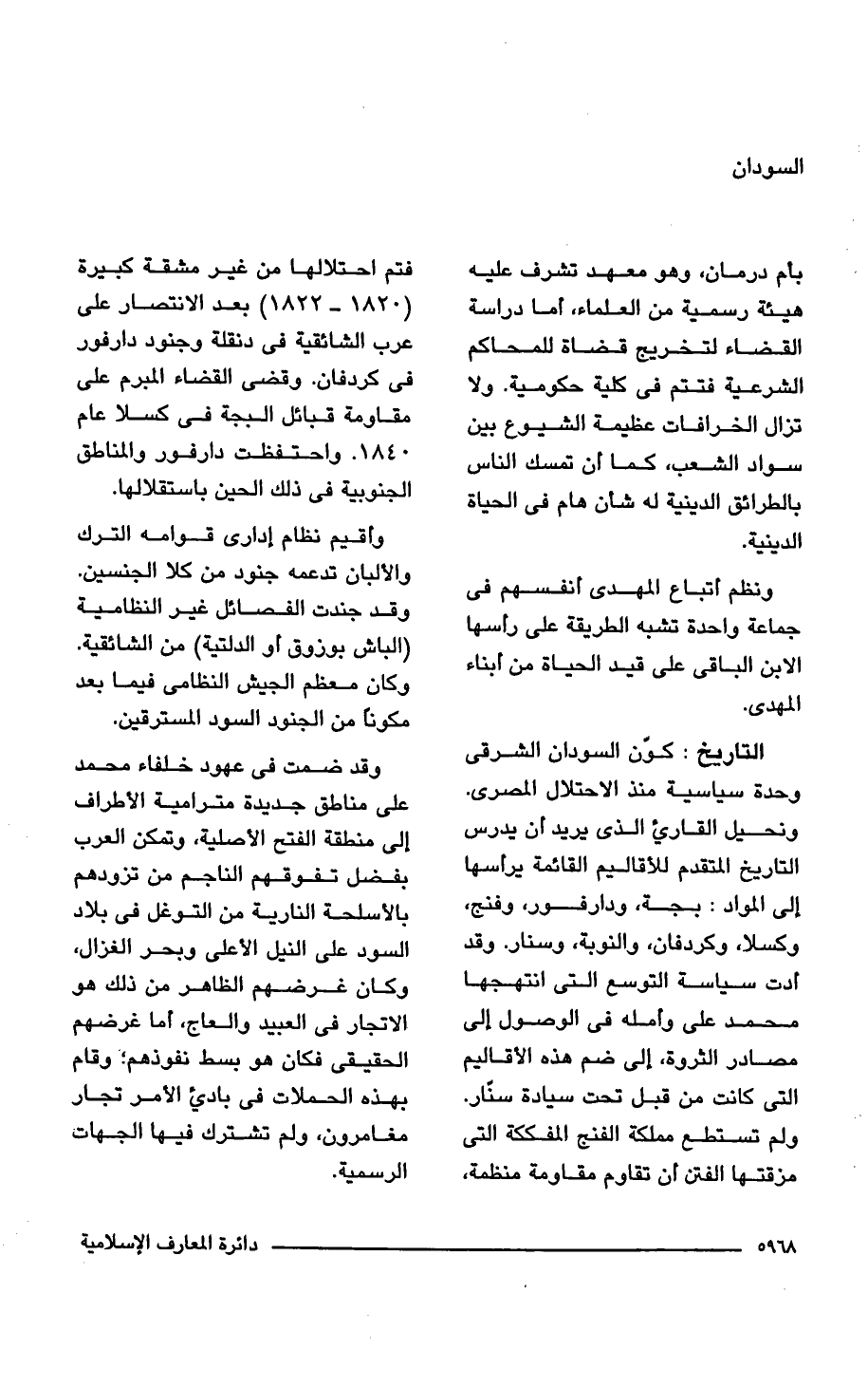 التاريخ: كوَّن السودان الشرقى وحدة سياسية منذ الاحتلال المصرى. ونحيل القارئ الذى يريد أن يدرس التاريخ المتقدم للأقاليم القائمة يرأسها إلى المواد: بجة، ودارفور، وفنج، وكسلا، وكردفان، والنوبة، وسنار. وقد أدت سياسة التوسع التى انتهجها محمد على وأمله فى الوصول إلى مصادر الثروة، إلى ضم هذه الأقاليم التى كانت من قبل تحت سيادة سنَّار. ولم تستطع مملكة الفنج المفككة التى مزقتها الفتن ان تقاوم مقاومة منظمة، فتم احتلالها من غير مشقة كبيرة (1820 - 1822) بعد الانتصار على عرب الشائقية فى دنقلة وجنود دارفور فى كردفان. وقضى القضاء المبرم على مقاومة قبائل البجة فى كسلا عام 1840. واحتفظت دارفور والمناطق الجنوبية فى ذلك الحين باستقلالها.
