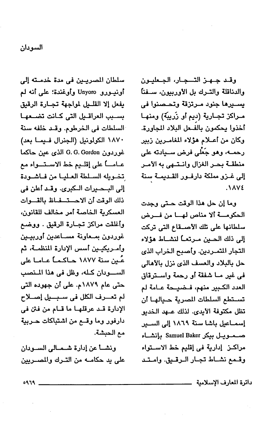 وما إن حل هذا الوقت حتى وجدت الحكومة ألا مناص لها من فرض سلطانها على تلك الأصقاع التى تركت إلى ذلك الحين مرتعًا لنشاط هؤلاء التجار المتمردين. وأصبح الخراب الذى حل بالبلاد والعسف الذى نزل بالأهالى فى غير ما شفقة أو رحمة واسترقاق العدد الكبير منهم، فضيحة عامة لم تستطع السلطات المصرية حيالها أن تظل مكتوفة الأيدى. لذلك عهد الخديو إسماعيل باشا سنة 1869 إلى السير صمويل بيكر Samuel Baker بإنشاء مراكز إدارية فى إقليم خط الاستواء وقمع نشاط تجار الرقيق. وامتد سلطان المصريين فى مدة خدمته إلى أونيورو Unyoro وأوغندة؛ على أنه لم يفعل إلا القليل لمواجهة تجارة الرقيق بسبب العراقيل التى كانت تضعها السلطات فى الخرطوم. وقد خلفه سنة 1870 الكولونيل (الجنرال فيما بعد) غوردون G.G.Gordon الذى عين حاكما عامًا على إقليم خط الاستواء مع تخويله السلطة العليا من فاشودة إلى البحيرات الكبرى. وقد أعلن فى ذلك الوقت أن الاحتفاظ بالقوات العسكرية الخاصة أمر مخالف للقانون، وأغلقت مراكز تجارة الرقيق. ووضع غوردون بمعاونة مساعدين أوربيين وأمريكيين أسس الإدارة المنظمة، ثم عُين سنة 1877 حاكمًا عامًا على السودان كله، وظل فى هذا المنصب حتى عام 1879 على أن جهوده التى لم تعرف الكلل فى سبيل إصلاح الإدارة قد عرقلها ما قام من فتن فى دارفور وما وقع من اشتباكات حربية مع الحبشة.
