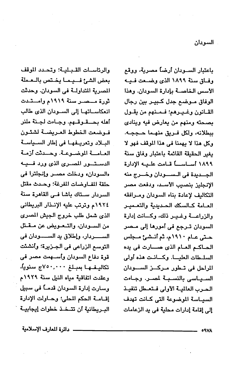 باعتبار السودان أرضًا مصرية، ووقع وفاق سنة 1899 الذى وضعت فيه الأسس الخاصة بإدارة السودان. وهذا الوفاق موضع جدل كبير بين رجال القانون وغيرهم؛ فمنهم من يقول بصحته ومنهم من يعارض فيه وينادى ببطلانه، ولكل فريق منهما حججه. وكل هذا لا يهمنا فى هذا الموقف فهو لا يغير الحقيقة القائمة باعتبار وفاق سنة 1899 أساسًا قامت عليه الإدارة الجديدة فى السودان وخرج منه الإنجليز بنصيب الأسد، ودفعت مصر التكاليف لإعادة بناء السودان ومرافقه العامة كالسكك الحديدية والتعمير والزراعة وغير ذلك، وكانت إدارة السودان ترجع فى أمورها إلى مصر حتى عام 1910 م، ثم أنشئ مجلس الحاكم العام الذى صارت فى يده السلطات العليا. وكانت هذه أولى المراحل فى تطور مركز السودان السياسى بالنسبة لمصر. وجاءت الحرب العالمية الأولى فتعطل تنفيذ السياسة الموضوعة التى كانت تهدف إلى إقامة إدارات محلية فى يد الزعامات والرئاسات القبلية؛ وتحدد الموقف بعض الشئ فيما يختص بالعملة المصرية المتداولة فى السودان. وحدثت ثورة مصر سنة 1919 م وامتدت انعكاساتها إلى السودان الذى طالب أهله بحقوقهم. وجاءت لجنة ملنر فوضعت الخطوط العريضة لشئون البلاد وتعريفها فى إطار السياسة العامة الموضوعة. وحدثت أزمة الدستور المصرى الذى ورد فيه "السودان" ودخلت مصر وإنجلترا فى حلقة المفاوضات المفرغة؛ وحدث مقتل السردار ستاك باشا فى القاهرة سنة 1924 م وترتب عليه الإنذار البريطانى الذى شمل طلب خروج الجيش المصرى من السودان، والتعويض عن مقتل السردار، وإطلاق يد السودان فى التوسع الزراعى فى الجزيرة؛ وأنشئت قوة دفاع السودان وأسهمت مصر فى تكاليفها بمبلغ 750.000 ج سنويًا، وعقدت اتفاقية مياه النيل سنة 1929 م وسارت إدارة السودان قدمًا فى سبيل إقامة الحكم المحلى؛ وحاولت الإدارة البريطانية أن تتخذ خطوات إيجابية