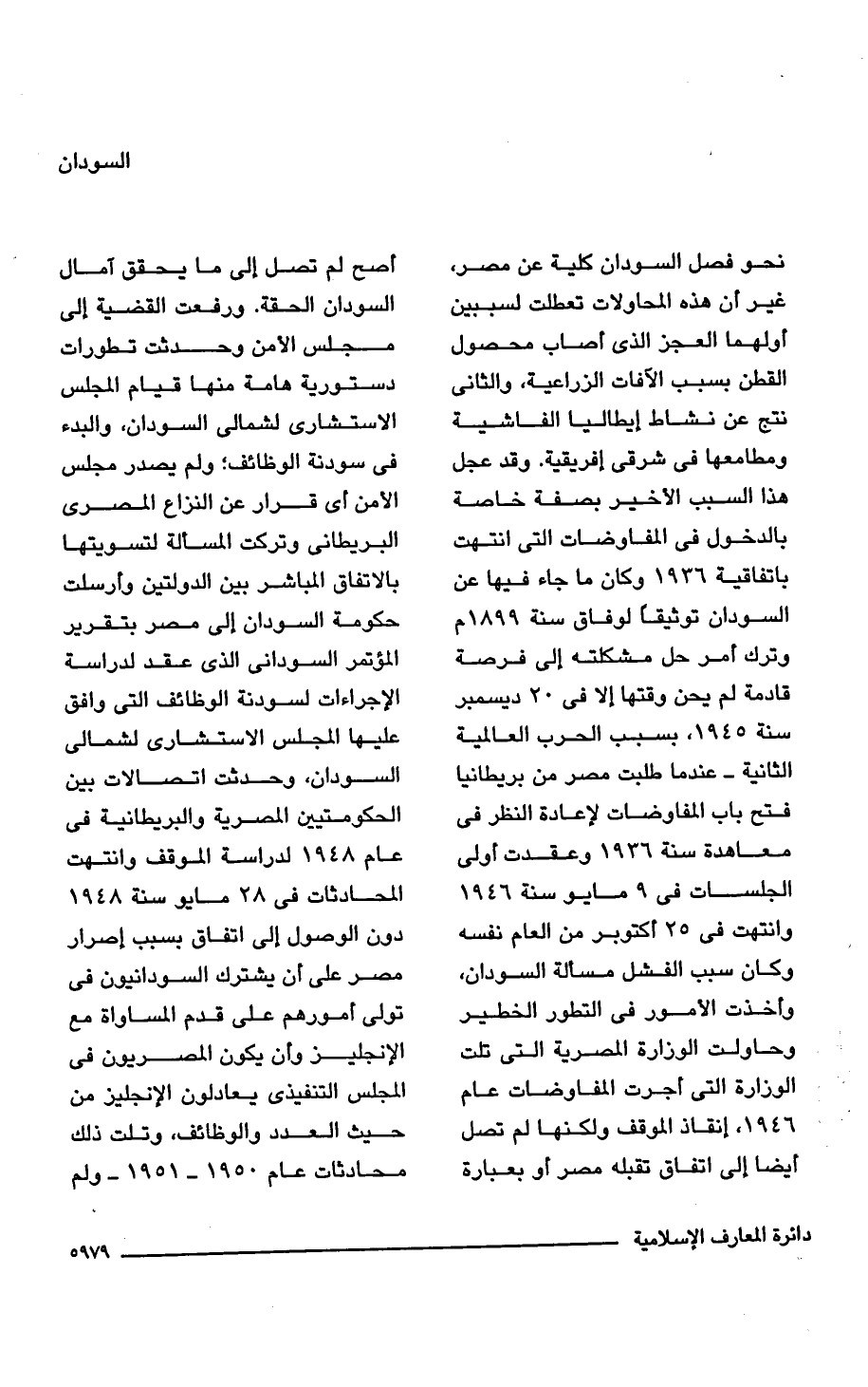 نحو فصل السودان كلية عن مصر، غير أن هذه المحاولات تعطلت لسببين أولهما العجز الذى أصاب محصول القطن بسبب الآفات الزراعية، والثانى نتج عن نشاط إيطاليا الفاشية ومطامعها فى شرقى إفريقية. وقد عجل هذا السبب الأخير بصفة خاصة بالدخول فى المفاوضات التى انتهت باتفاقية 1936 وكان ما جاء فيها عن السودان توثيقًا لوفاق سنة 1899 م وترك أمر حل مشكلته إلى فرصة قادمة لم يحن وقتها إلا فى 20 ديسمبر سنة 1945 بسبب الحرب العالمية الثانية -عندما طلبت مصر من بريطانيا فتح باب المفاوضات لإعادة النظر فى معاهدة سنة 1936 وعقدت أولى الجلسات فى 9 مايو سنة 1946 وانتهت فى 25 أكتوبر من العام نفسه وكان سبب الفشل مسألة السودان، وأخذت الأمور فى التطور الخطير وحاولت الوزارة المصرية التى تلت الوزارة التى أجرت المفاوضات عام 1946, إنقاذ الموقف ولكنها لم تصل أيضًا إلى اتفاق تقبله مصر أو بعبارة أصح لم تصل إلى ما يحقق آمال السودان الحقة. ورفعت القضية إلى مجلس الأمن وحدثت تطورات دستورية هامة منها قيام المجلس الاستشارى لشمالى السودان، والبدء فى سودنة الوظائف؛ ولم يصدر مجلس الأمن أى قرار عن النزاع المصرى البريطانى وتركت المسألة لتسويتها بالاتفاق المباشر بين الدولتين وأرسلت حكومة السودان إلى مصر بتقرير المؤتمر السودانى الذى عقد لدراسة الإجراءات لسودنة الوظائف التى وافق عليها المجلس الاستشارى لشمالى السودان، وحدثت اتصالات بين الحكومتين المصرية والبريطانية فى عام 1948 لدراسة الموقف وانتهت المحادثات فى 28 مايو سنة 1948 دون الوصول إلى اتفاق بسبب إصرار مصر على أن يشترك السودانيون فى تولى أمورهم على قدم المساواة مع الإنجليز وأن يكون المصريون فى المجلس التنفيذى يعادلون الإنجليز من حيث العدد والوظائف، وتلت ذلك محادثات عام 1950 - 1951 - ولم