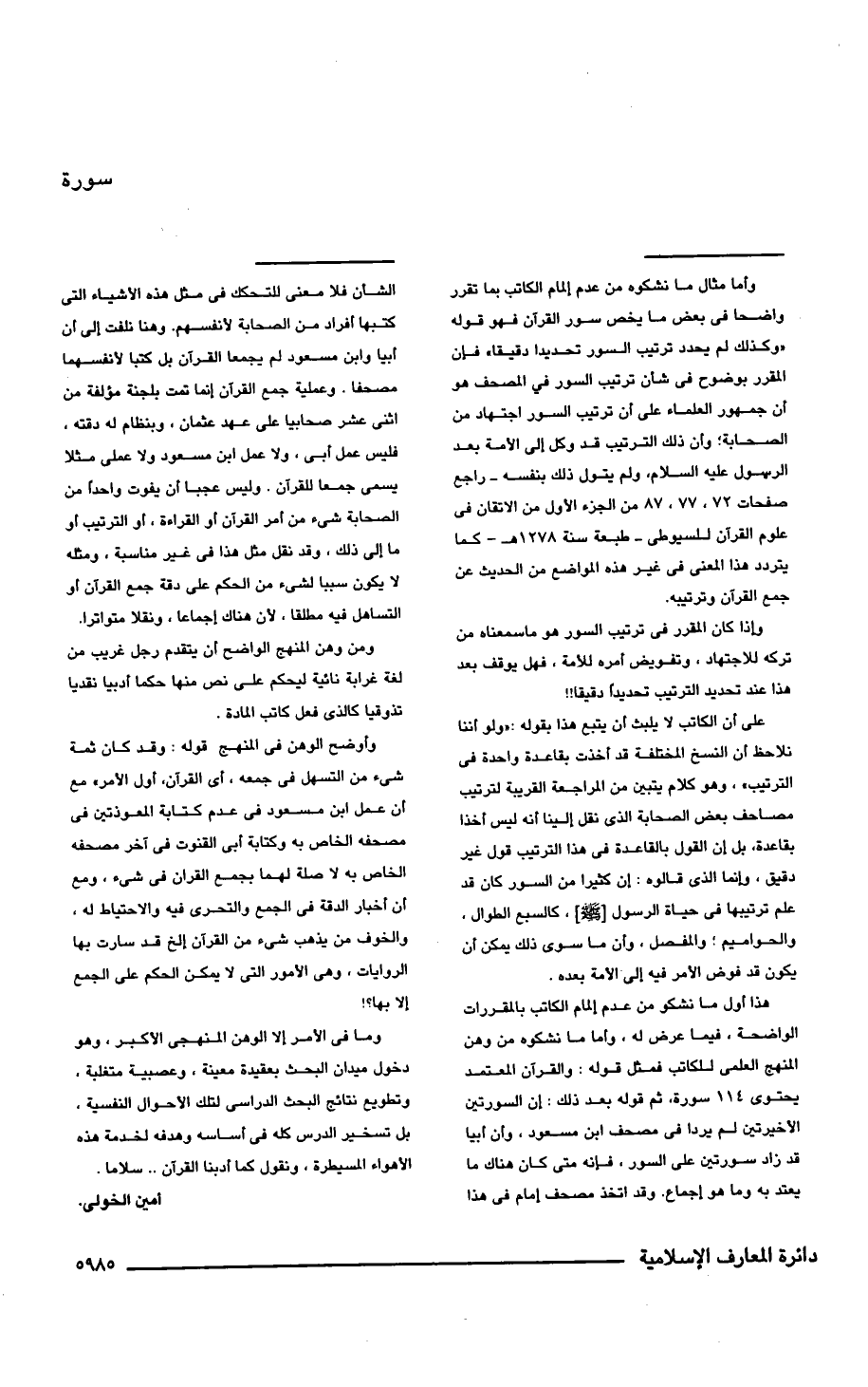 هذا أول ما نشكو من عدم إلمام الكاتب بالمقررات الواضحة، فيما عرض له، وأما ما نشكوه من وهن المنهج العلمى للكاتب فمثل قوله: والقرآن المعتمد يحتوى 114 سورة، ثم قوله بعد ذلك: إن السورتين الأخيرتين لم يردا فى مصحف ابن مسعود، وأن أبيا قد زاد سورتين على السور، فإنه متى كان هناك ما يعتد به وما هو إجماع. وقد اتخذ مصحف إمام فى هذا الشأن فلا معنى للتحكك فى مثل هذه الأشياء التى كتبها أفراد من الصحابة لأنفسهم. وهنا نلفت إلى أن أبيا وابن مسعود لم يجمعا القرآن بل كتبا لأنفسهما مصحفا. وعملية جمع القرآن إنما تمت بلجنة مؤلفة من اثنى عشر صحابيا على عهد عثمان، وبنظام له دقته، فليس عمل أبى، ولا عمل ابن مسعود ولا عملى مثلا يسمى جمعا للقرآن. وليس عجبا أن يفوت واحدًا من الصحابة شئ من أمر القرآن أو القراءة، أو الترتيب أو ما إلى ذلك، وقد نقل مثل هذا فى غير مناسبة، ومثله لا يكون سببا لشئ من الحكم على دقة جمع القرآن أو التساهل فيه مطلقا، لأن هناك إجماعا، ونقلا متواترا.