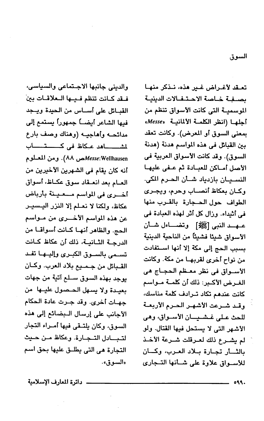 تعقد لأغراض غير هذه، نذكر منها بصفة خاصة الاحتفالات الدينية الموسمية التى كانت الأسواق تنظم من أجلها (انظر الكلمة الألمانية " Messe" بمعنى السوق أو المعرض). وكانت تعقد بين القبائل فى هذه المواسم هدنة (هدنة السوق). وقد كانت الأسواق العربية فى الأصل أماكن للعبادة ثم عفى عليها النسيان بازدياد شأن الحرم المكى. وكان بعكاظ أنصاب وحرم, ويجرى الطواف حول الحجارة بالقرب منها فى أثيداء. وزال كل أثر لهذه العبادة فى عهد النبى [-صلى اللَّه عليه وسلم-] وتضاءل شأن الأسواق شيئًا فشيئًا من الناحية الدينية بسبب الحج إلى مكة إلا انها استفادت من نواح أخرى لقربها من مكة. وكانت الأسواق فى نظر معظم الحجاج هى الغرض الأكبر: ذلك أن كلمة مواسم كانت عندهم تكاد ترادف كلمة مناسك، وقد شرعت الأشهر الحرم الأربعة للحث على غشيان الأسواق، وهى الأشهر التى لا يستحل فيها القتال. ولو لم يشرع ذلك لعرقلت شرعة الأخذ بالثأر تجارة بلاد العرب، وكان للأسواق علاوة على شأنها التجارى والدينى جانبها الاجتماعى والسياسى، فقد كانت تنظم فيها العلاقات بين القبائل على أساس من الحيدة ويجد فيها الشاعر أيضًا جمهورًا يستمع إلى مدائحه وأهاجيه (وهناك وصف بارع لمشاهد عكاظ فى كتاب Messe: Wellhausen ص 88). ومن المعلوم أنه كان يقام فى الشهرين الأخيرين من العام بعد انعقاد سوق عكاظ، أسواق أخرى فى المواسم معينة بأرباض عكاظ، ولكنا لا نعلم إلا النزر اليسير عن هذه المواسم الأخرى من مواسم الحج. والظاهر أنها كانت أسواقا من الدرجة الثانية، ذلك أن عكاظ كانت تسمى بالسوق الكبرى وإليها تفد القبائل من جميع بلاد العرب. وكان يوجد بهذه السوق سلع آتية من جهات بعيدة ولا يسهل الحصول عليها من جهات أخرى. وقد جرت عادة الحكام الأجانب على إرسال البضائع إلى هذه السوق، وكان يلتقى فيها أمراء التجار لتبادل التجارة. وعكاظ من حيث التجارة هى التى يطلق عليها بحق اسم "السوق".