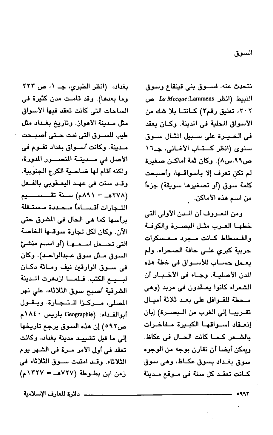 نتحدث عنه. فسوق بنى قينقاع وسوق النبيط (انظر La Mecque: Lammens ص 302، تعليق رقم 3) كانتا بلا شك من الأسواق المحلية فى المدينة. وكان يعقد فى الحيرة على سبيل المثال سوق سنوى (انظر كتاب الأغانى، جـ 16 ص 99، س 8). وكان ثمة أماكن صغيرة لم تكن تعرف إلا بأسواقها، وأصبحت كلمة سوق (أو تصغيرها سويقة) جزءًا من اسم هذه الأماكن.