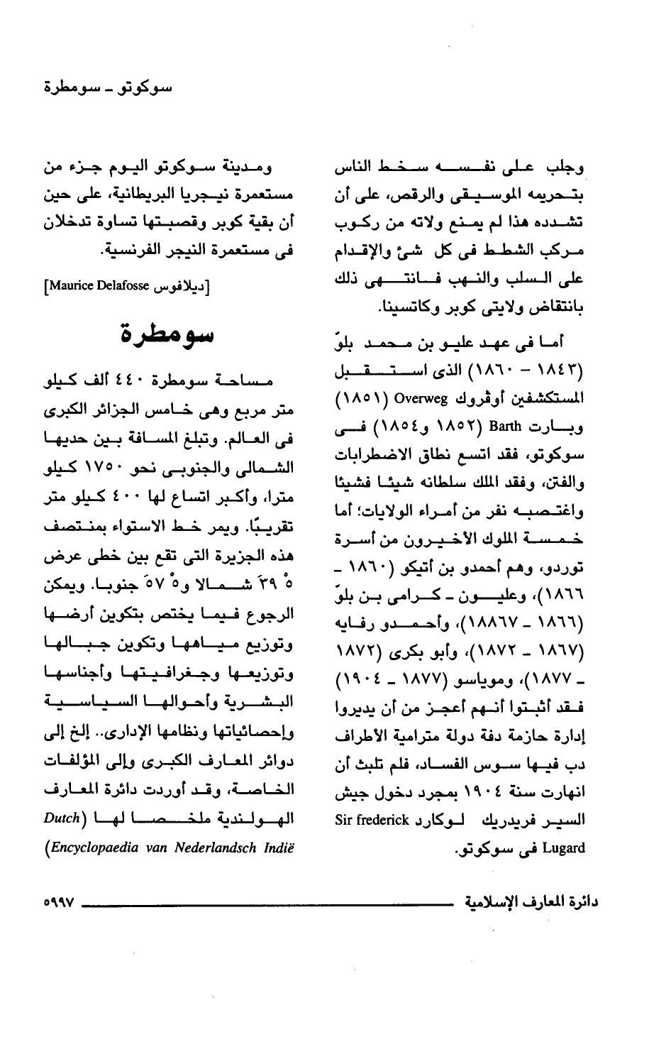 مساحة سومطرة 440 ألف كيلو متر مربع وهى خامس الجزائر الكبرى فى العالم. وتبلغ المسافة بين حديها الشمالى والجنوبى نحو 1750 كيلو مترا، وأكبر اتساع لها 400 كيلو متر تقريبًا. ويمر خط الاستواء بمنتصف هذه الجزيرة التى تقع بين خطى عرض 5 ْ 39 َ شمالا و 5 ْ 57 َ جنوبا. ويمكن الرجوع فيما يختص بتكوين أرضها وتوزيع مياهها وتكوين جبالها وتوزيعها وجغرافيتها وأجناسها البشرية وأحوالها السياسية وإحصائياتها ونظامها الإدارى. . إلخ إلى دوائر المعارف الكبرى وإلى المؤلفات الخاصة، وقد أوردت دائرة المعارف الهولندية ملخصا لها (Dutch Encyclopaedia van Nederlandsch Indie)