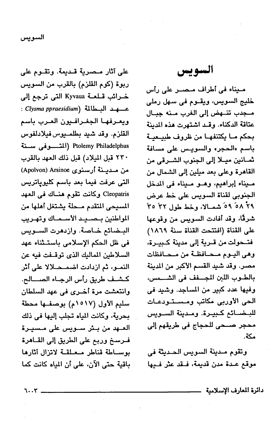 ميناء فى أطراف مصر على رأس خليج السويس، ويقوم فى سهل رملى مجدب تنهض إلى الغرب منه جبال عتاقة الدكناء. وقد اشتهرت هذه المدينة بحكم ما يكتنفها من ظروف طبيعية باسم "الحجر" والسويس على مسافة ثمانين ميلا إلى الجنوب الشرقى من القاهرة وعلى بعد ميلين إلى الشمال من ميناء إبراهيم، وهو ميناء فى المدخل الجنوبى لقناة السويس على خط عرض 29 ْ 58 َ 59 َ شمالًا، وخط طول 32 َ 35 َ شرقًا، وقد أفادت السويس من وقوعها على القناة (افتتحت القناة سنة 1869) فتحولت من قرية إلى مدينة كبيرة، وهى اليوم محافظة من محافظات مصر. وقد شيد القسم الأكبر من المدينة بالطوب اللبن المجفف فى الشمس، وفيها عدد كبير من المساجد. وشيد فى الحى الأوربى مكاتب ومستودعات للبضائع كبيرة. ومدينة السويس محجر صحى للحجاج فى طريقهم إلى مكة.