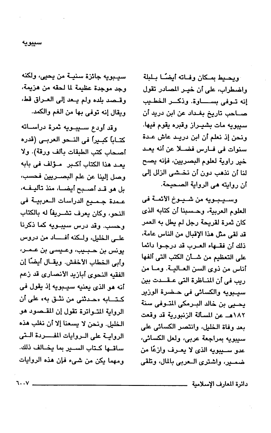 وسيبويه من شيوخ الأئمة فى العلوم العربية، وحسبنا أن كتابه الذى كان ثمرة لقريحة رجل لم يطل به العمر قد لقى مثل هذا الإقبال من الناس عامة، ذلك أن فقهاء العرب قد درجوا دائمًا على التعظيم من شأن الكتب التى ألفها أناس من ذوى السن العالية. وما من ريب فى أن المناظرة التى عقدت بين سيبويه والكسائى فى حضرة الوزير يحيى بن خالد البرمكى المتوفى سنة 182 هـ عن المسألة الزنبورية قد وقعت بعد وفاة الخليل، وانتصر الكسائى على سيبويه بمراجعة عربى، ولعل الكسائى، عدو سيبويه الذى لا يعرف وازعًا من ضمير، واشترى العربى بالمال، وتلقى سيبويه جائزة سنية من يحيى، ولكنه وجد موجدة عظيمة لما لحقه من هزيمة، وقصد بلده ولم يعد إلى العراق قط، ويقال إنه توفى بها من الغم والكمد.