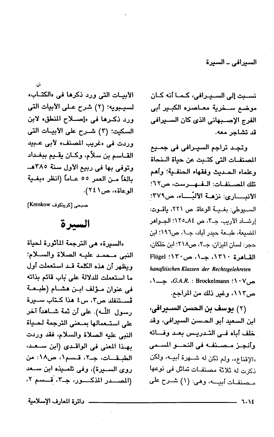 " السيرة" هى الترجمة المأثورة لحياة النبى محمد عليه الصلاة والسلام؛ ويظهر أن هذه الكلمة قد استعملت أول ما استعملت للدلالة على باب قائم بذاته فى عنوان مؤلف ابن هشام (طبعة فستنفلد ص 3، س 4 هذا كتاب سيرة رسول اللَّه). على أن ثمة شاهدًا آخر على استعمالها بمعنى الترجمة لحياة النبى عليه الصلاة والسلام، فقد وردت بهذا المعنى فى الواقدى (ابن سعد، الطبقات، جـ 2، قسم 1، ص 18: من روى السيرة)، وفى تلميذه ابن سعد (المصدر المذكور، جـ 3، قسم 2،