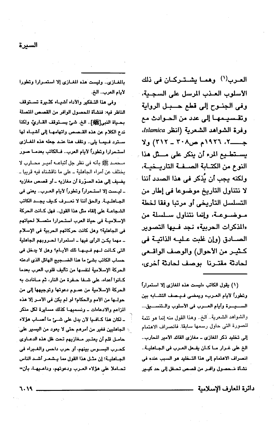 (¬1) يقول الكاتب "ليست هذه المغازى إلا استمرارًا وتطورًا لأيام العرب" ويمضى فيصف التشابه بين السيرة وأيام العرب فى الأسلوب والتنسيق. . . والشواهد الشعرية. . الخ. . وهذا القول منه إنما هو تتمة للصورة التى حاول رسمها سابقا. فانصراف الاهتمام إلى تخليد ذكر المغازى - مغازى القائد الأمير المحارب. . الخ على غرار ما كان يفعل العرب فى الجاهلية. . انصراف الاهتمام إلى هذا التخليد هو السبب عنده فى نشأة محصول وافر من قصص تحفل إلى حد كبير بالمغازى. . وليست هذه المغازى إلا استمرارًا وتطورا لأيام العرب. . الخ.