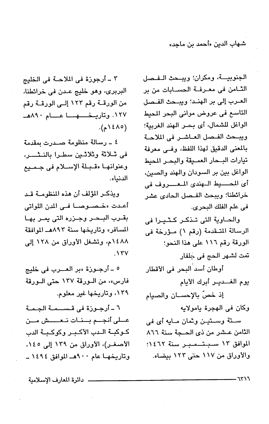 3 - أرجوزة فى الملاحة فى الخليج البربرى، وهو خليج عدن فى خرائطنا، من الورقة رقم 123 إلى الورقة رقم 127. وتاريخها عام 890 هـ (1485 م).