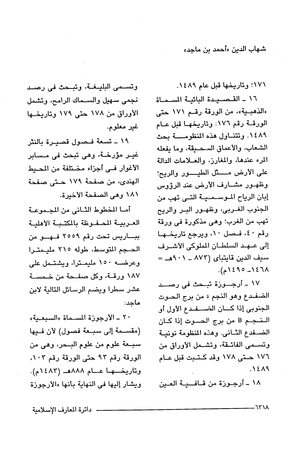 16 - القصيدة البائية المسماة "الذهبية"، من الورقة رقم 171 حتى الورقة رقم 176: وتاريخها قبل عام 1489. وتتناول هذه المنظومة بحث الشعاب، والأعماق السحيقة، وما يفعله المرء عندها، والمغارز، والعلامات الدالة على الأرض مثل الطيور والريح؛ وظهور مشارف الأرض عند الرؤوس إبان الرياح الموسمية التى تهب من الجنوب الغربى، وظهور البر والريح تهب من الغرب؛ وهى مذكورة فى ورقة رقم 40، فصل 10، ويرجع تاريخها إلى عهد السلطان المملوكى الأشرف سيف الدين قايتباى (873 - 901 هـ = 1468 - 1495 م).