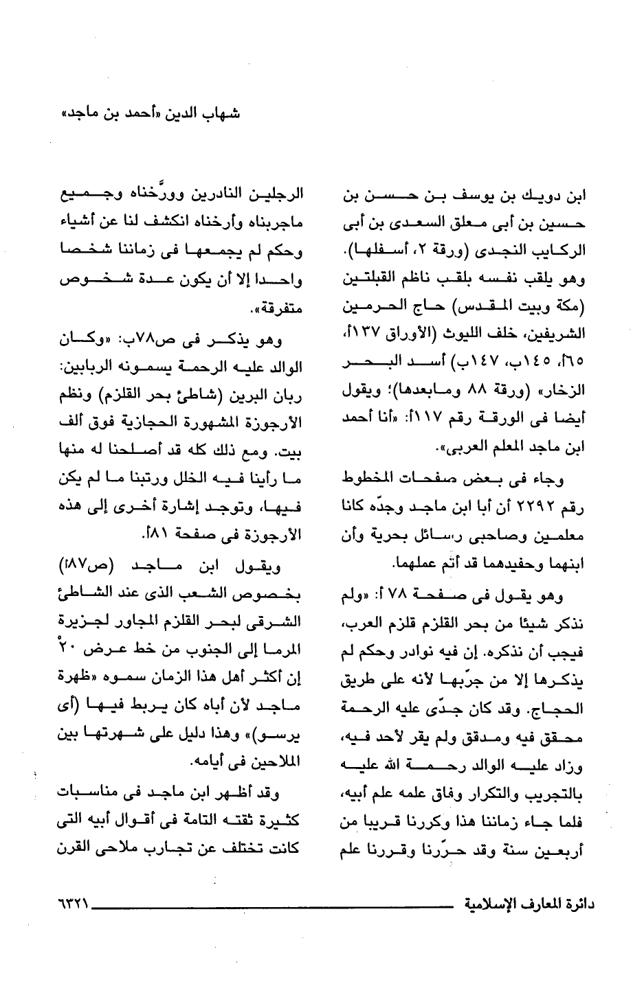 وجاء فى بعض صفحات المخطوط رقم 2292 أن أبا ابن ماجد وجدّه كانا معلمين وصاحبى رسائل بحرية وأن ابنهما وحفيدهما قد أتم عملهما.