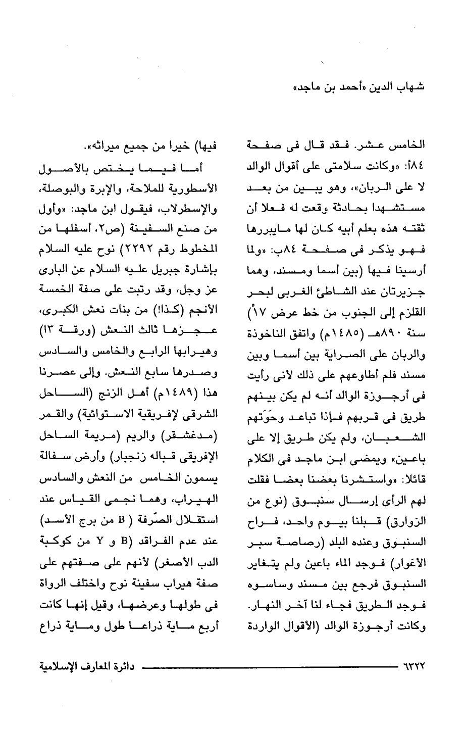 الخامس عشر. فقد قال فى صفحة 84 أ: "وكانت سلامتى على أقوال الوالد لا على الربان"، وهو يبين من بعد مستشهدا بحادث وقعت له فعلا أن ثقته هذه بعلم أبيه كان لها ما يبررها فهو يذكر فى صفحة 84 ب: "ولما أرسينا فيها (بين أسما ومسند، وهما جزيرتان عند الشاطئ الغربى لبحر القلزم إلى الجنوب من خط عرض 17) سنة 890 هـ (1485 م) واتفق الناخوذة والربان على الصراية بين أسما وبين مسند فلم أطاوعهم على ذلك لأنى رأيت فى أرجوزة الوالد أنه لم يكن بينهم طريق فى قربهم فإذا تباعد وحَوَتهم الشعبان، ولم يكن طريق إلا على باعين" ويمضى ابن ماجد فى الكلام قائلا: "واستشرنا بعضنا بعضا فقلت لهم الرأى إرسال سنبوق (نوع من الزوارق) قبلنا بيوم واحد، فراح السنبوق وعنده البلد (رصاصة سبر الأغوار) فوجد الماء باعين ولم يتغاير السنبوق فرجع بين مسند وساسوه فوجد الطريق فجاء لنا آخر النهار. وكانت أرجوزة الوالد (الأقوال الواردة فيها) خيرا من جميع ميراثه".