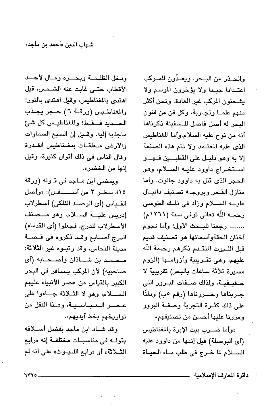 والحذر من البحر، ويعدّون للمركب اعتدادا جيدا ولا يؤخرون الموسم ولا يشحنون المركب غير العادة. ونحن أكثر منهم علما وتجربة، وكل فن من فنون البحر له أصل فاصل للسفينة ذكرناها أنه من نوح عليه السلام. وأما المغناطيس الذى عليه المعتمد ولا تتم هذه الصنعة إلا به وهو دليل على القطبين فهو استخراج داوود عليه السلام، وهو الحجر الذى قتل به داوود جالوت. وأما منازل القمر وبروجه تصنيف دانيال عليه السلام وزاد فى ذلك الطوسى رحمه اللَّه تعالى توفى سنة (1261 م). . . . . رجعنا للبحث الأول؛ وأما نجوم أخنان الحقة وأسمائها هو تصنيف قديم قبل الليوث المتقدم ذكرهم رحمة اللَّه عليهم، وهى تقريبية وأزوامها (الزوم مسيرة ثلاثة ساعات بالبحر) تقريبية لا حقيقية، ولذلك صفات البرور التى جربناها وحررناها (رقم 5 ب) ودلنّا على ذلك كثرة التجربة وصفة البرور ومررنا عليها أحسن من تصنيفهم".