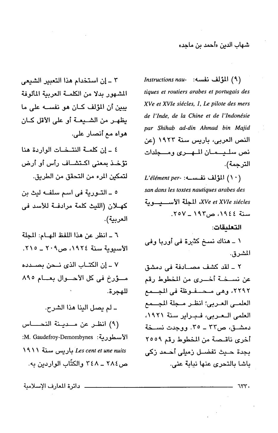 (9) المؤلف نفسه: Instructions nautiques et routiers arabes et portugais des XVe et XVIe siecles, I, Le pilote des mers de L'Inde, de la Chine et de L'Indonesie par Shihab ad-din Ahmad bin Majid، النص العربى، باريس سنة 1923 (عن نص سليمان المهرى ومجلدات الترجمة).