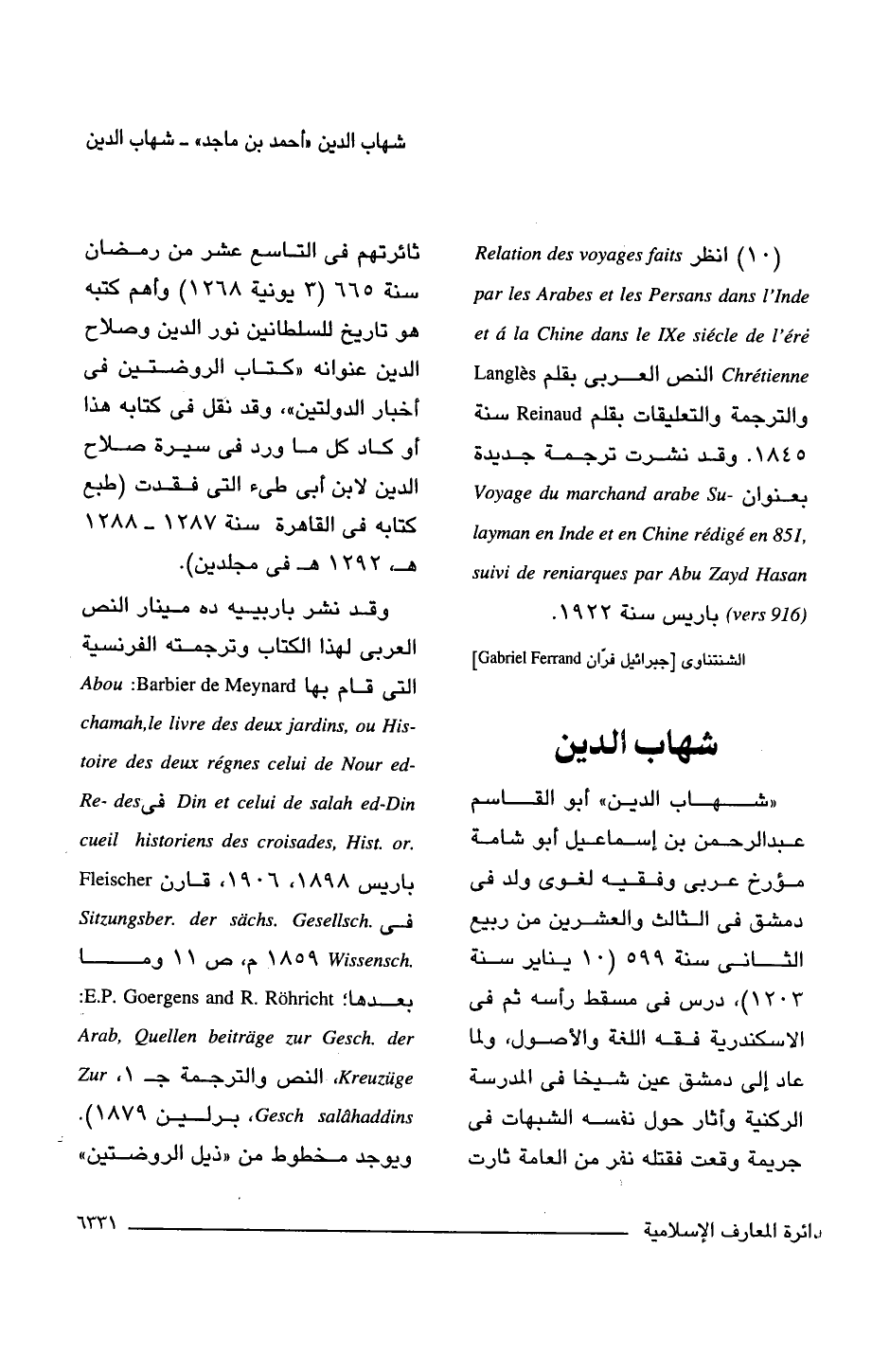 (10) انظر Relation des voyages faits par les Arabes et les Persans dans l'Inde et a la Chine dans le IXe siecle de l'ere Chretienne النص العربى بقلم Langles والترجمة والتعليقات بقلم Reinand سنة 1845. وقد نشرت ترجمة جديدة بعنوان Voyage du marchand arabe Sulayman en Inde et en Chine redige en 851, Suivi de reniarques par Abu Zayd Hasan (916 vers) باريس سنة 1922.