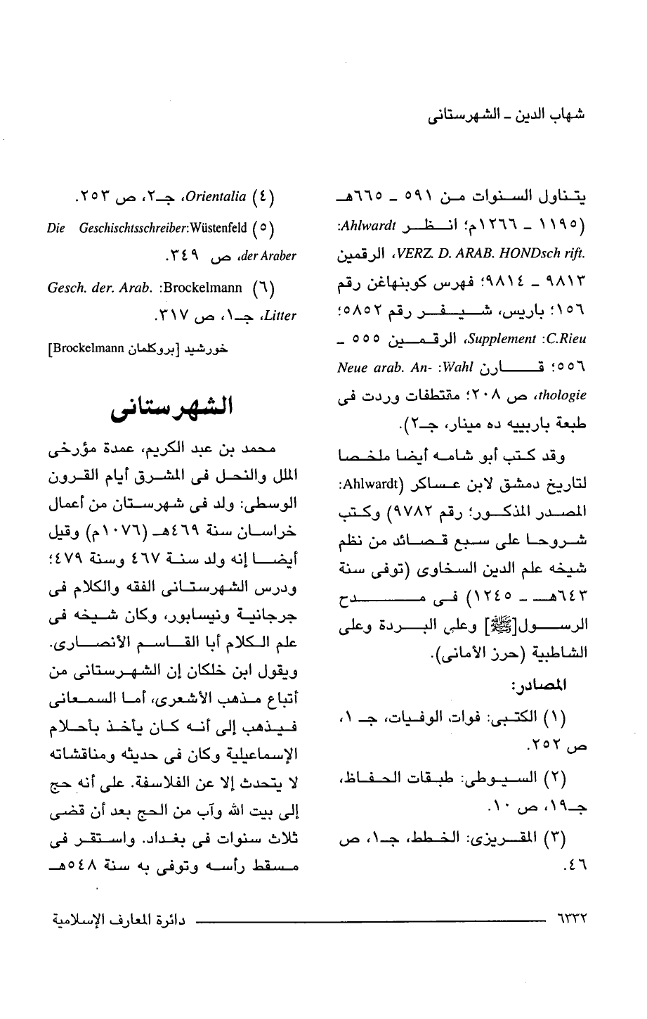 محمد بن عبد الكريم، عمدة مؤرخى الملل والنحل فى المشرق أيام القرون الوسطى: ولد فى شهرستان من أعمال خراسان سنة 469 هـ (1076 م) وقيل أيضا إنه ولد سنة 467 وسنة 479؛ ودرس الشهرستانى الفقه والكلام فى جرجانية ونيسابور، وكان شيخه فى علم الكلام أبا القاسم الأنصارى. ويقول ابن خلكان إن الشهرستانى من أتباع مذهب الأشعرى، أما السمعانى فيذهب إلى أنه كان يأخذ بأحلام الإسماعيلية وكان فى حديثه ومناقشاته لا يتحدث إلا عن الفلاسفة. على أنه حج إلى بيت اللَّه وآب من الحج بعد أن قضى ثلاث سنوات فى بغداد. واستقر فى مسقط رأسه وتوفى به سنة 548 هـ