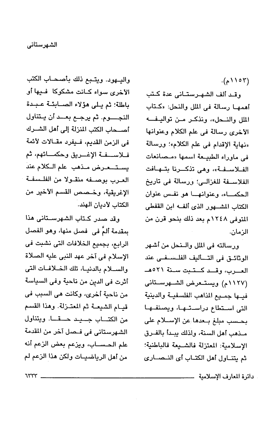 وقد ألف الشهرستانى عدة كتب أهمها رسالة فى الملل والنحل: "كتاب الملل والنحل"، ونذكر من تواليفه الأخرى رسالة فى علم الكلام وعنوانها "نهاية الإقدام فى علم الكلام"؛ ورسالة فى ما وراء الطبيعة اسمها "مصانعات الفلاسفة"، وهى تذكرنا بتهافت الفلاسفة للغزالى؛ ورسالة فى تاريخ الحكماء، وعنوانها هو نفس عنوان الكتاب المشهور الذى ألفه ابن القفطى المتوفى 1248 م بعد ذلك بنحو قرن من الزمان.