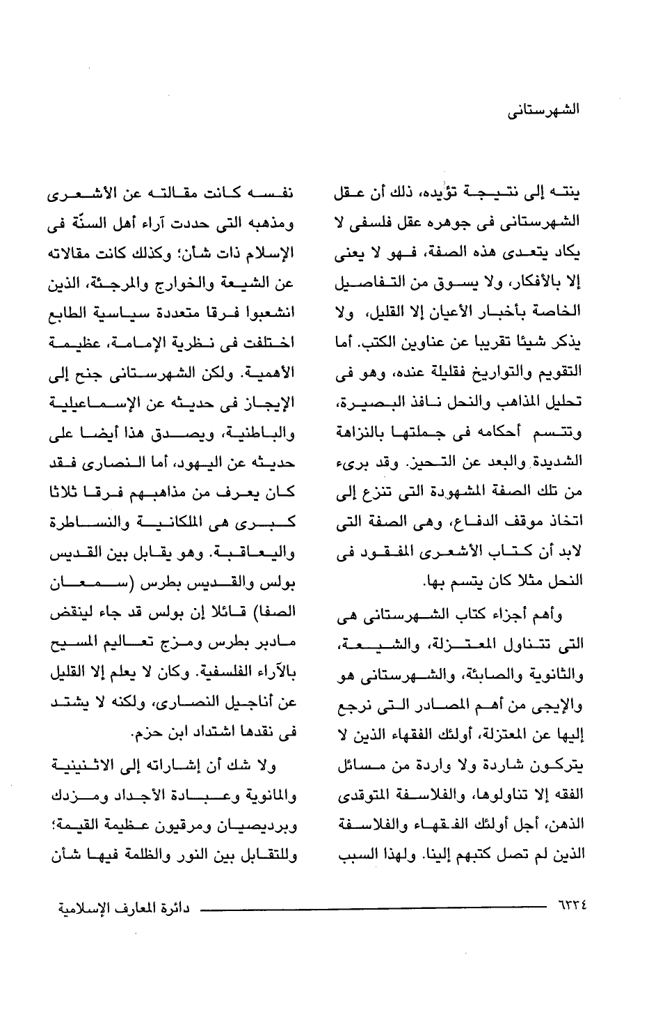 ينته إلى نتيجة تؤيده، ذلك أن عقل الشهرستانى فى جوهره عقل فلسفى لا يكاد يتعدى هذه الصفة، فهو لا يعنى إلا بالأفكار، ولا يسوق من التفاصيل الخاصة بأخبار الأعيان إلا القليل، ولا يذكر شيئا تقريبا عن عناوين الكتب. أما التقويم والتواريخ فقليلة عنده، وهو فى تحليل المذاهب والنحل نافذ البصيرة، وتتسم أحكامه فى جملتها بالنزاهة الشديدة والبعد عن التحيز. وقد برئ من تلك الصفة المشهودة التى تنزع إلى اتخاذ موقف الدفاع، وهى الصفة التى لابد أن كتاب الأشعرى المفقود فى النحل مثلا كان يتسم بها.