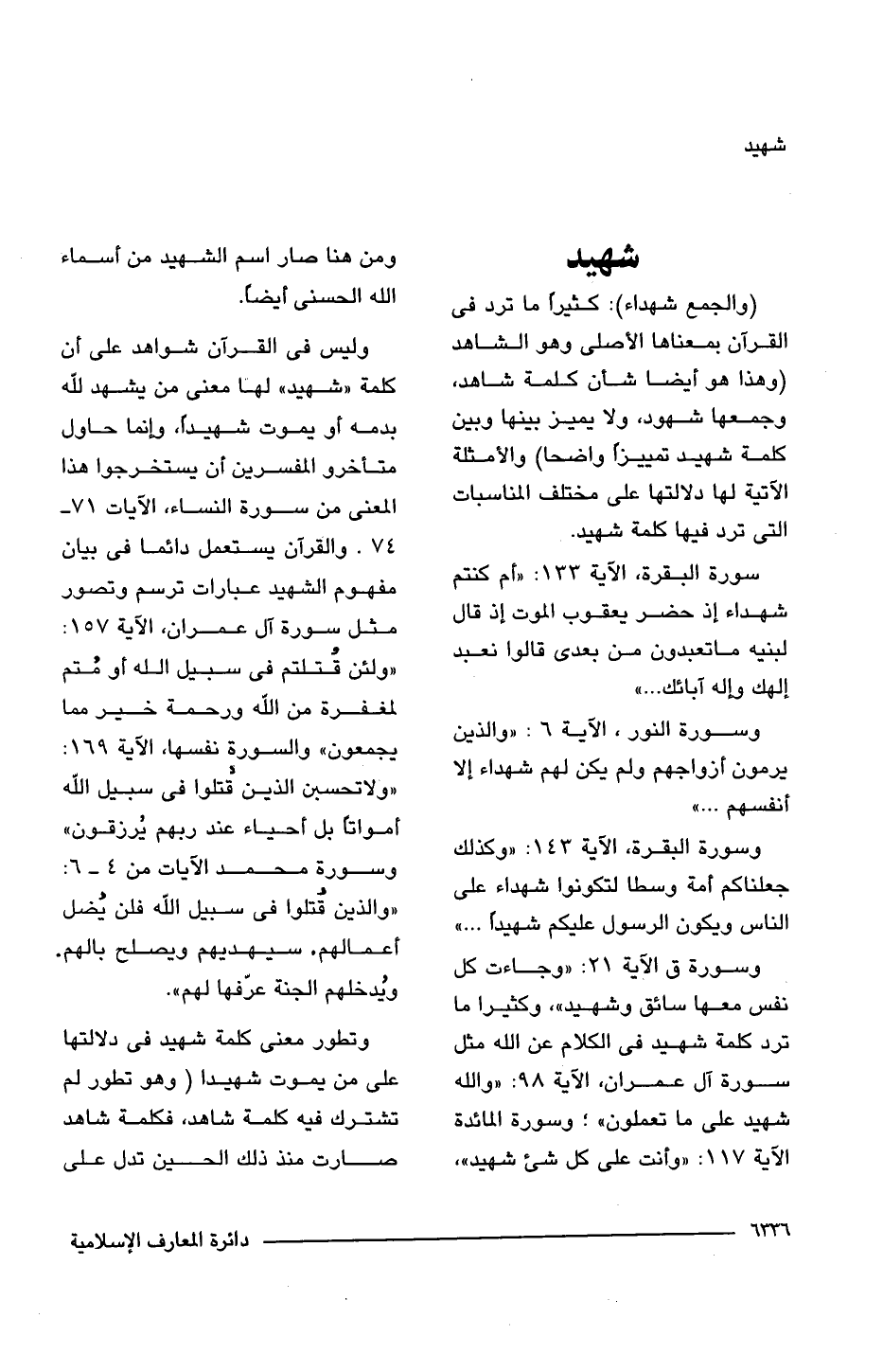 (والجمع شهداء): كثيرًا ما ترد فى القرآن بمعناها الأصلى وهو الشاهد (وهذا هو أيضا شأن كلمة شاهد، وجمعها شهود، ولا يميز بينها وبين كلمة شهيد تمييزًا واضحا) والأمثلة الآتية لها دلالتها على مختلف المناسبات التى ترد فيها كلمة شهيد.